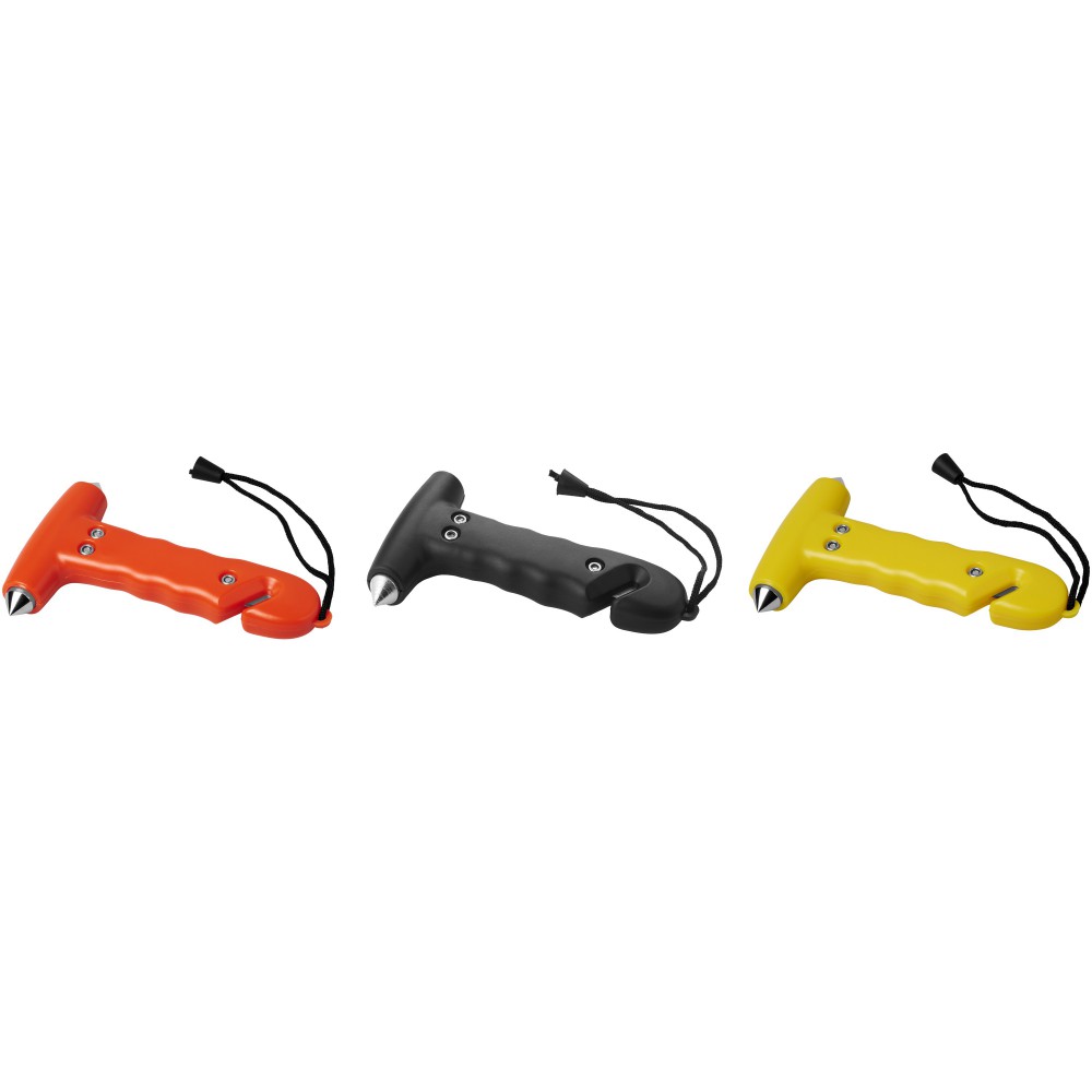 Kalapács vészhelyzet esetére, a markolatában a biztonsági öv elvágására alkalmas vágórésszel.