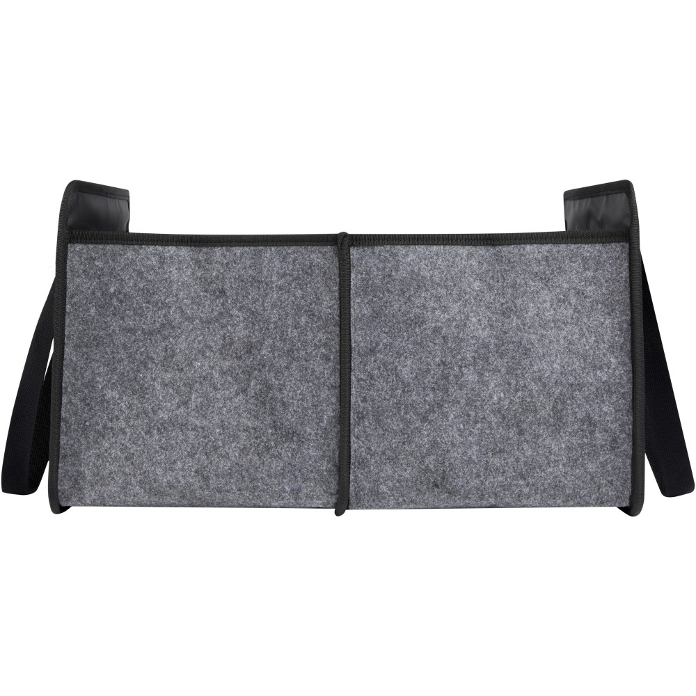 Puha és tartós, kiváló minőségű, GRS tanúsítvánnyal rendelkező újrahasznosított filcből készült összecsukható táska. 2 nagy rekesszel, megerősített alsó lapokkal, elülső zsebbel, hálós zsebbel és 2 hosszú szövött pamut füllel (30 x 2,5 cm). Ideális elektromos járműve töltőkábeleinek tárolására, élelmiszerek szállítására vagy egyszerűen a rend fenntartására az autóban vagy otthon. Minden erőfeszítés nélkül a helyére hajtható, és egy rugalmas pánt gondoskodik arról, hogy szépen összecsukva maradjon. Zárt mélység: 4,5 cm. Nyitott mélység: 48 cm.