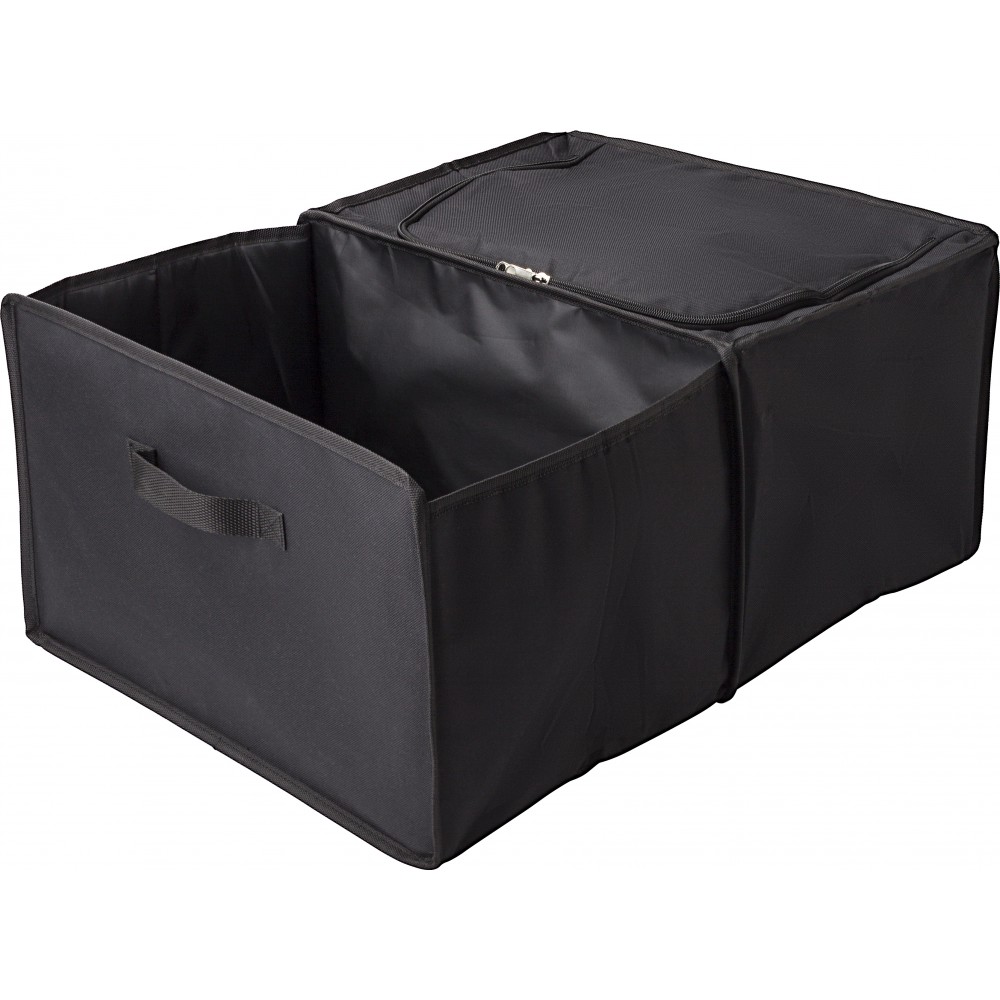 Autós rendező. Két rekesz, amelyből az egyik egy cipzárral zárható hűtőtáska alu szigeteléssel. Laposra hajtogatható. 600D poliészter.