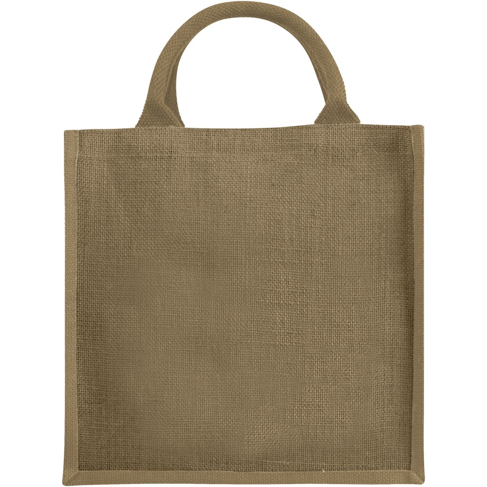 Nyitott tetejű jutaszatyor háromszög alakú oldalbetéttel. Sodort pamutfüllel.