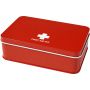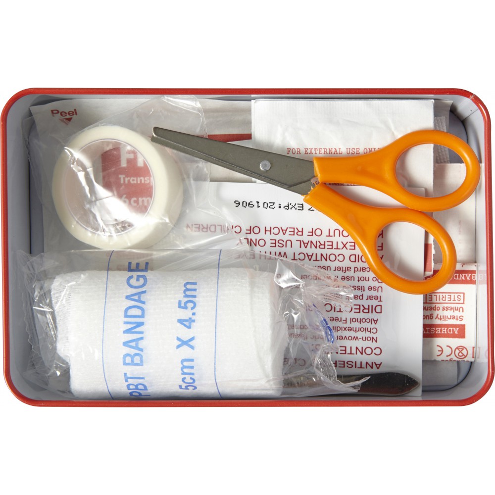 Elsősegélykészlet fém dobozban 15 kellékkel: olló, nedves törlőkendő, ragtapasz, 4 alkoholos törlőke, 5 ragtapasz, 1 gézlap, 1 fertőtlenítő törlő.
