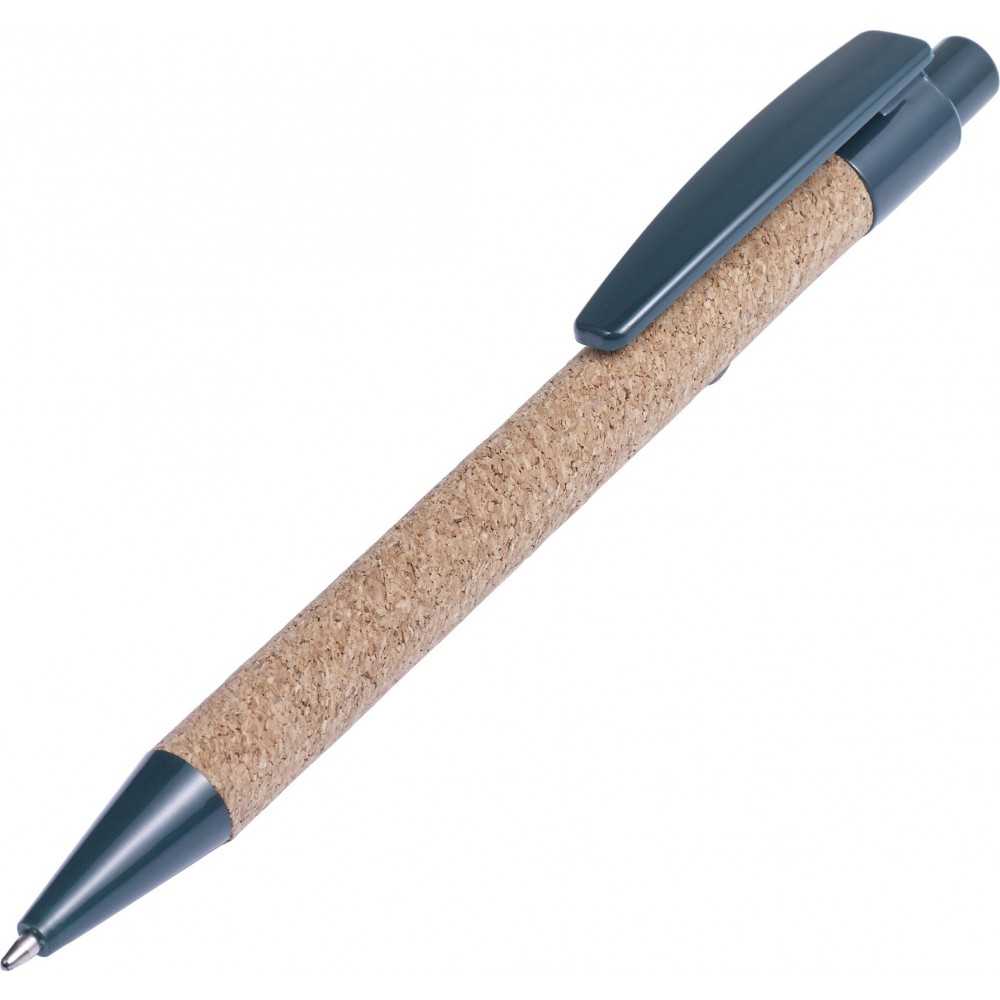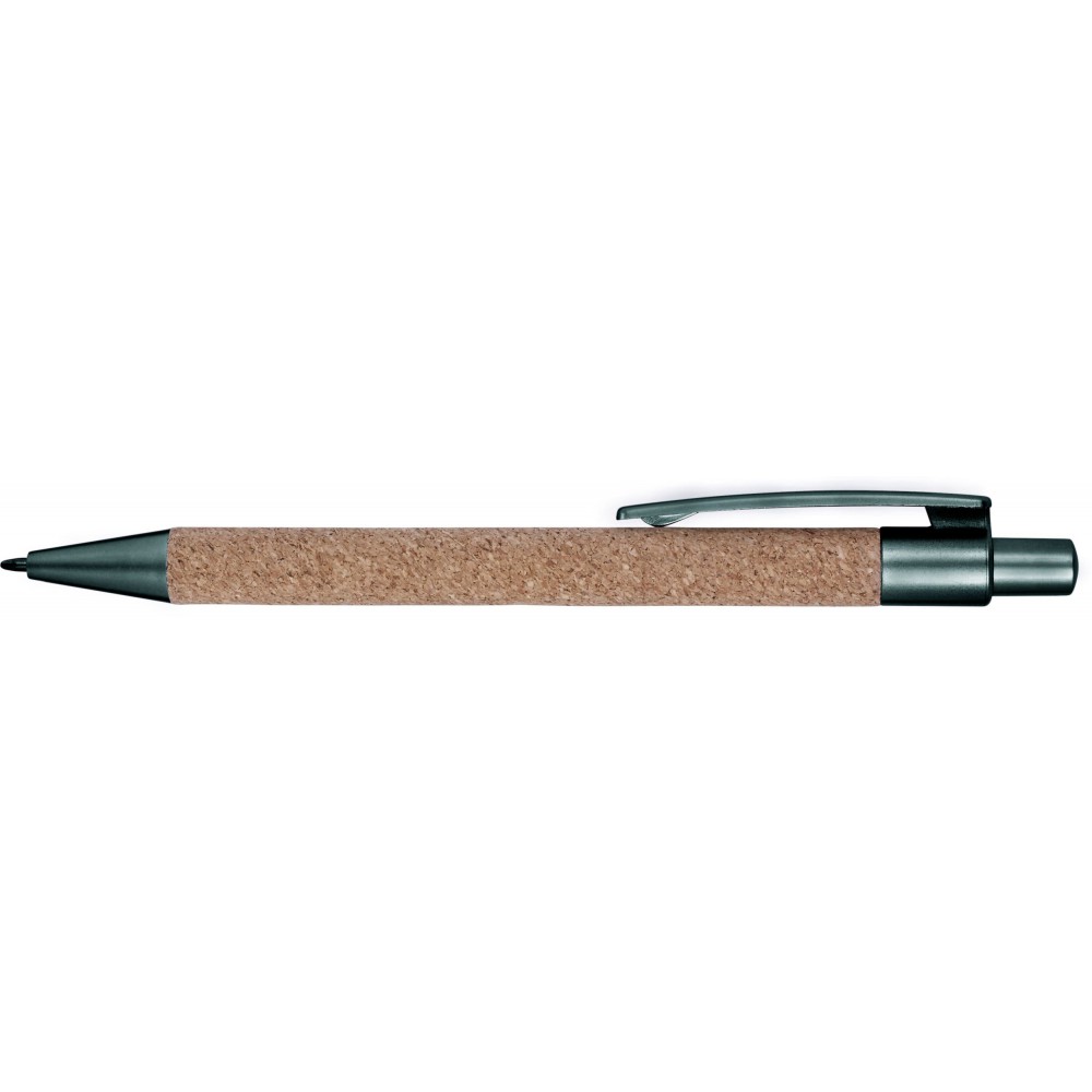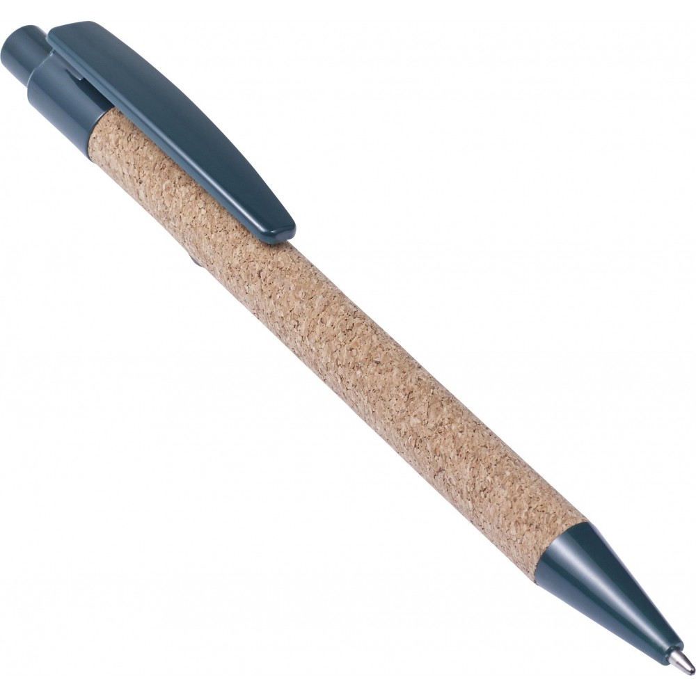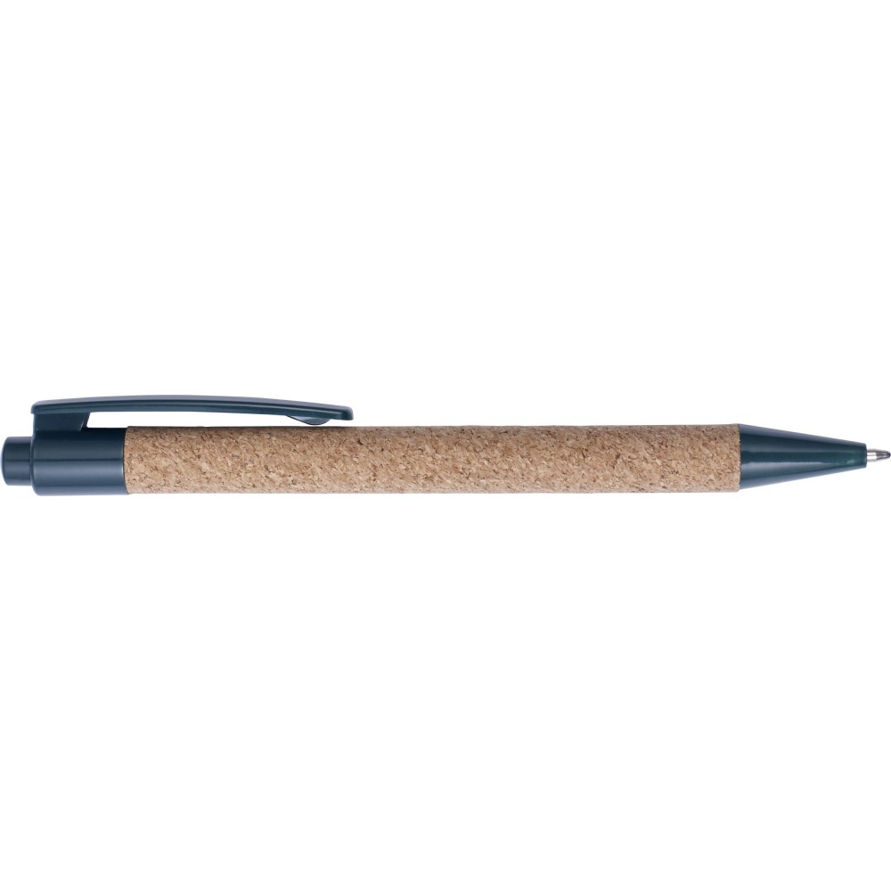 Golyóstoll parafa tolltesttel és műanyag véggel, klipsszel és nyomógombbal. Kék tollbetéttel. ABS, parafa.