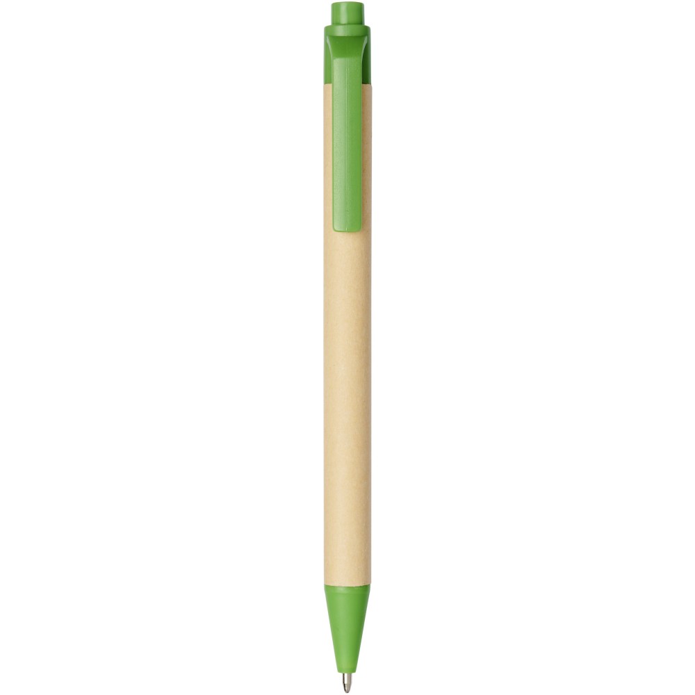 Környezetbarát golyóstoll fekete tollbetéttel, nyomógombos mechanizmussal, biológiailag lebomló papíranyagból készült tolltest és kukorica műanyag kiegészítők. Az újrahasznosított kartondoboz színe nem egységes.