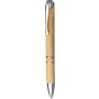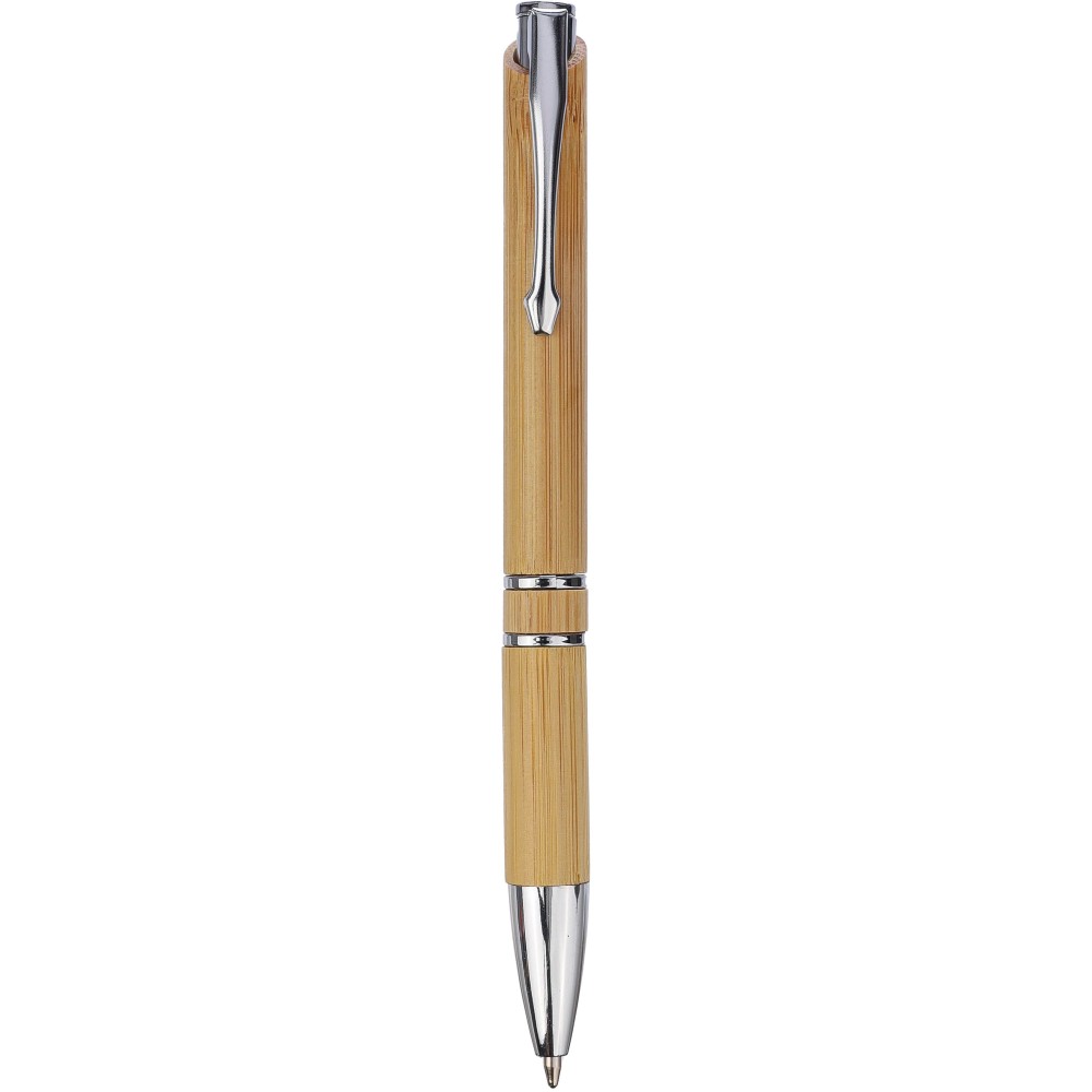 Bambusz golyóstoll krómozott fém részletekkel és nyomógombbal. Műanyag gyűrűkkel, nyomógombbal és tollheggyel. Fém klipsszel. Kb. 800 méter íráshossz. Fekete tollbetéttel.