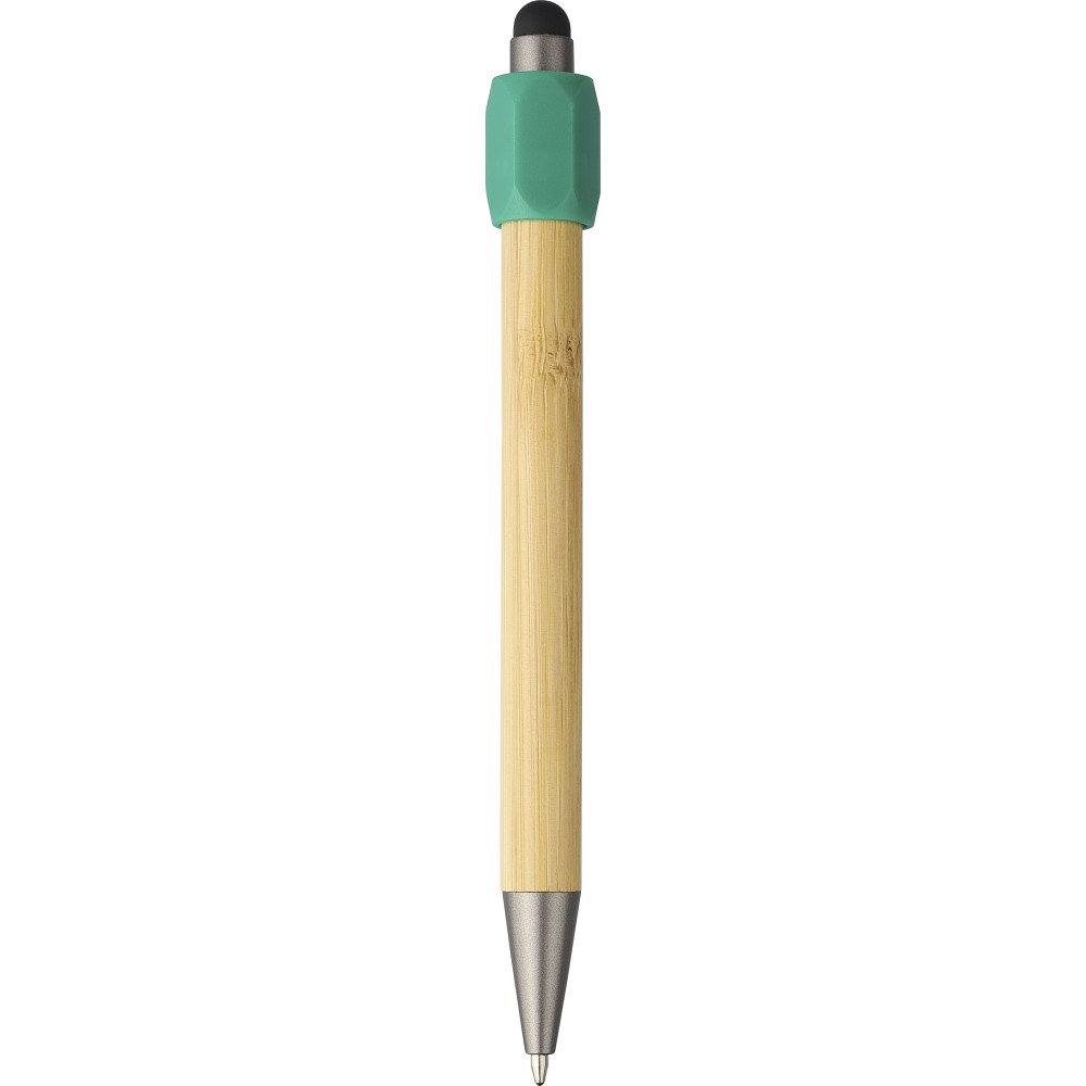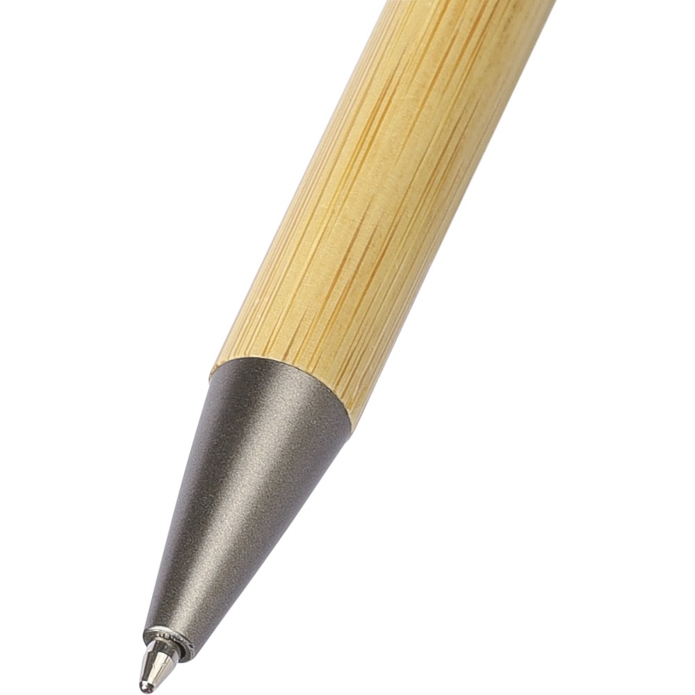 Bambusz golyóstoll újrahasznosított ABS pörgettyűvel és fekete érintővel a nyombógombon. A tollhegy vastagsága 1.0 mm, íráshossz: kb. 800 méter. Az újrahasznosított anyagra utaló logó a tollra van gravírozva.