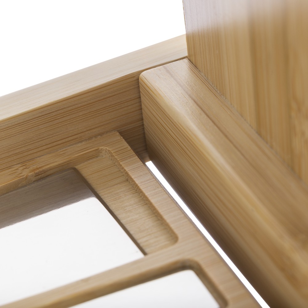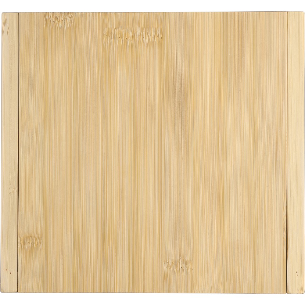 Bambusz sajtvágó deszka kihajtható fedéllel és 4 db, bükkfa nyéllel rendelkező rozsdamentes acél eszközzel. A dobozban kényelmesen elhelyezhető minden sajtkés. Csomagolása barna papírdoboz.