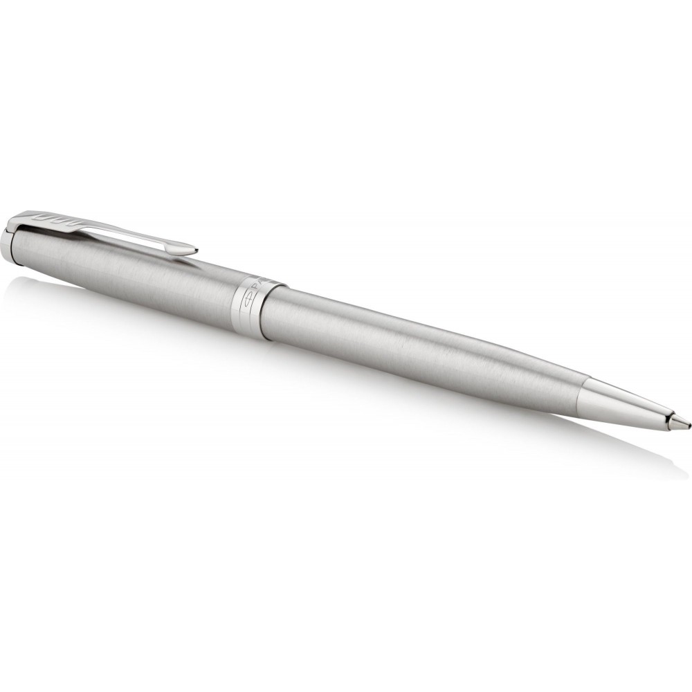 Rozsdamentes acél Parker Sonnet golyóstoll nyomógombos működéssel, fekete tollbetéttel. Csomagolása Parker doboz.