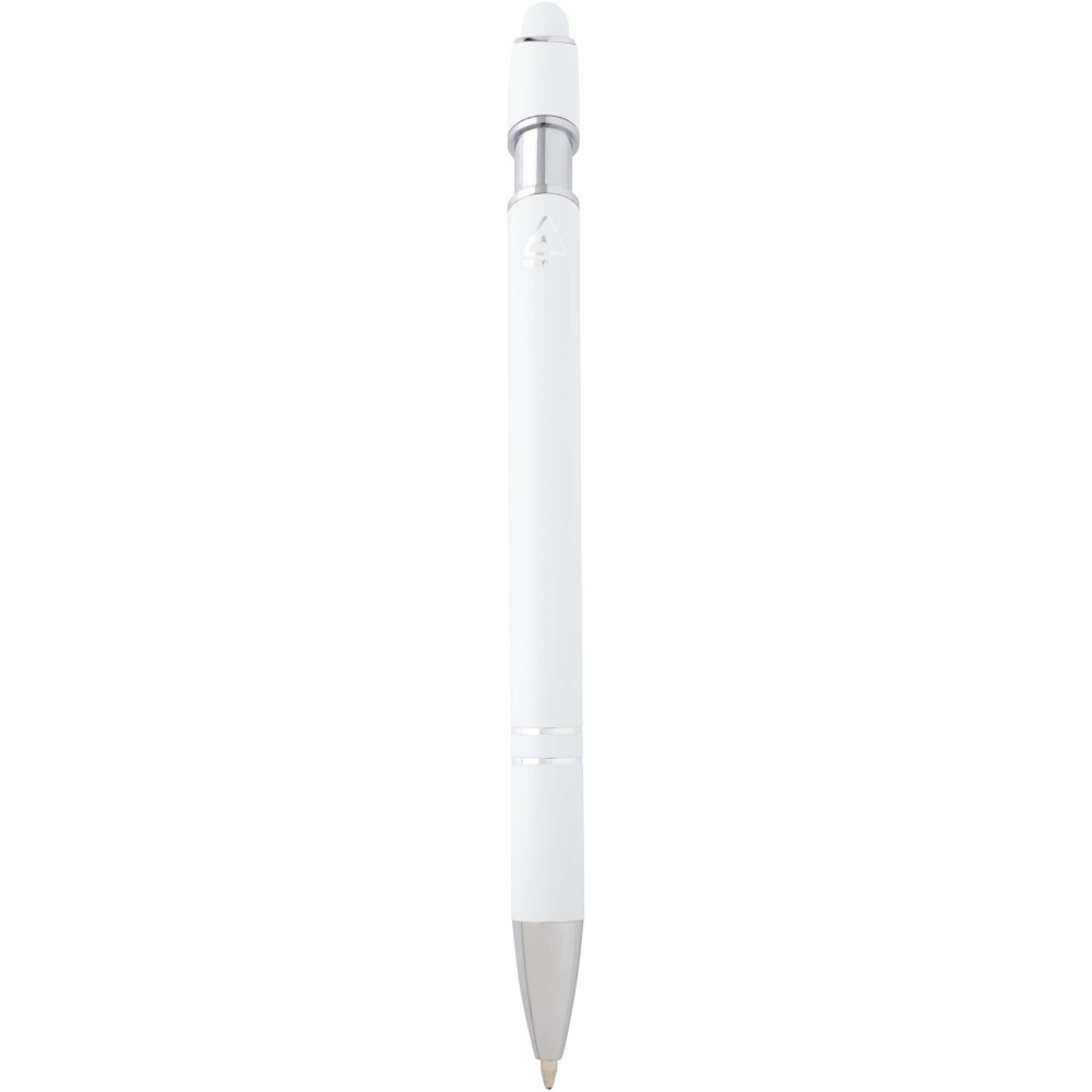 Kish golyóstoll ezüst színben. A toll teste újrahasznosított alumíniumból, az érintőceruza pedig szilikonból készült, így érintőképernyős eszközökhöz is használható. Az újrahasznosított alumínium csökkenti a hulladéklerakók terhelését, segít megőrizni a természeti erőforrásokat, és célja az üvegházhatású gázok kibocsátásának mérséklése. Tinta színe: kék. Íráshossz: 800 méter. Tollhegy mérete: 1,0 mm.