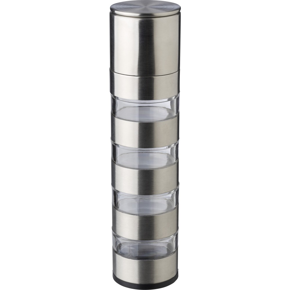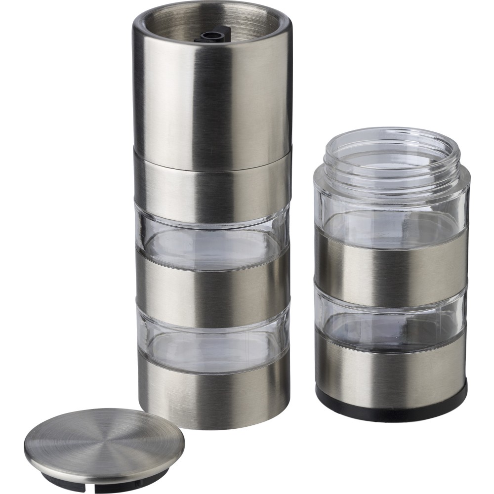 Rozsdamentes acél fűszerdaráló 4 résszel és kerámia őrlővel. Egyenként csomagolva, barna kartondobozban.