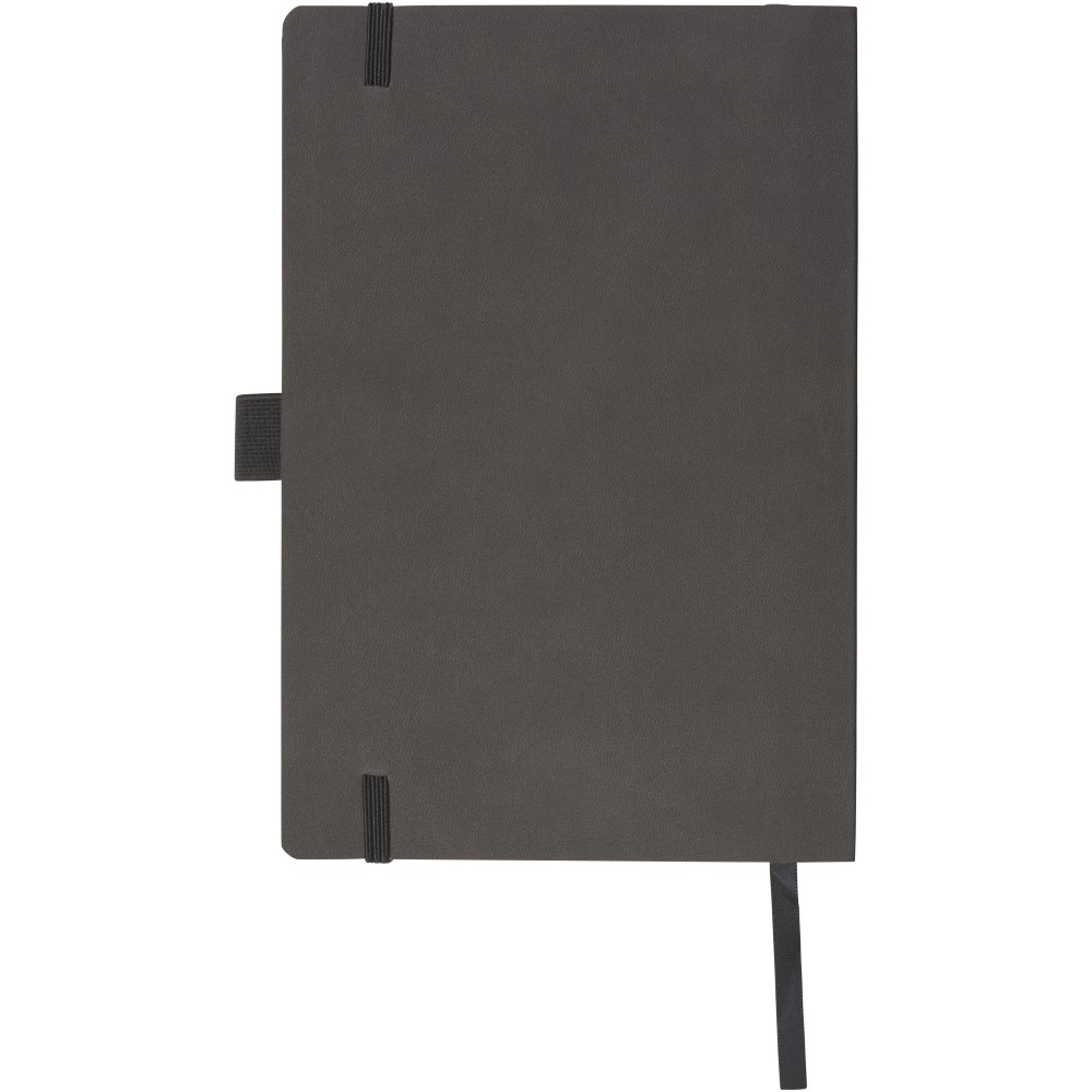 Puha borítású (A/5) jegyzetfüzet, gumis záródással, jelölővel, tolltartó hurokkal, hátoldalán zsebbel jegyzetek tárolására. 80 db krém színű vonalas (80gsm) lappal. Fekete papírhüvelybe csomagolva.
