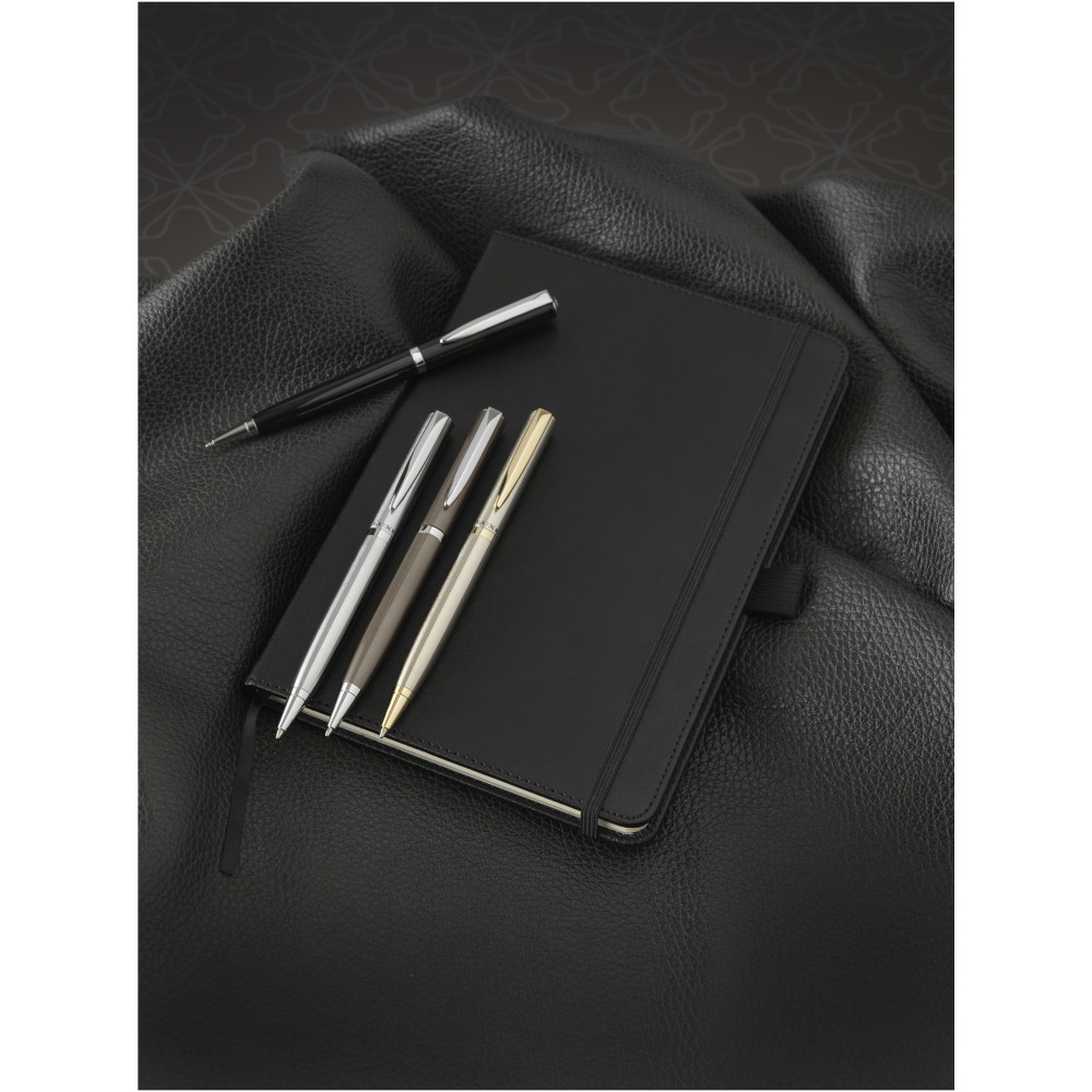 Kiválóan kialakított A5 méretű füzet, 80 db krémszínű vonalas lappal, belső merevítő lappal és tollhurokkal. Csomagolása Luxe ajándékdoboz. Műbőr.