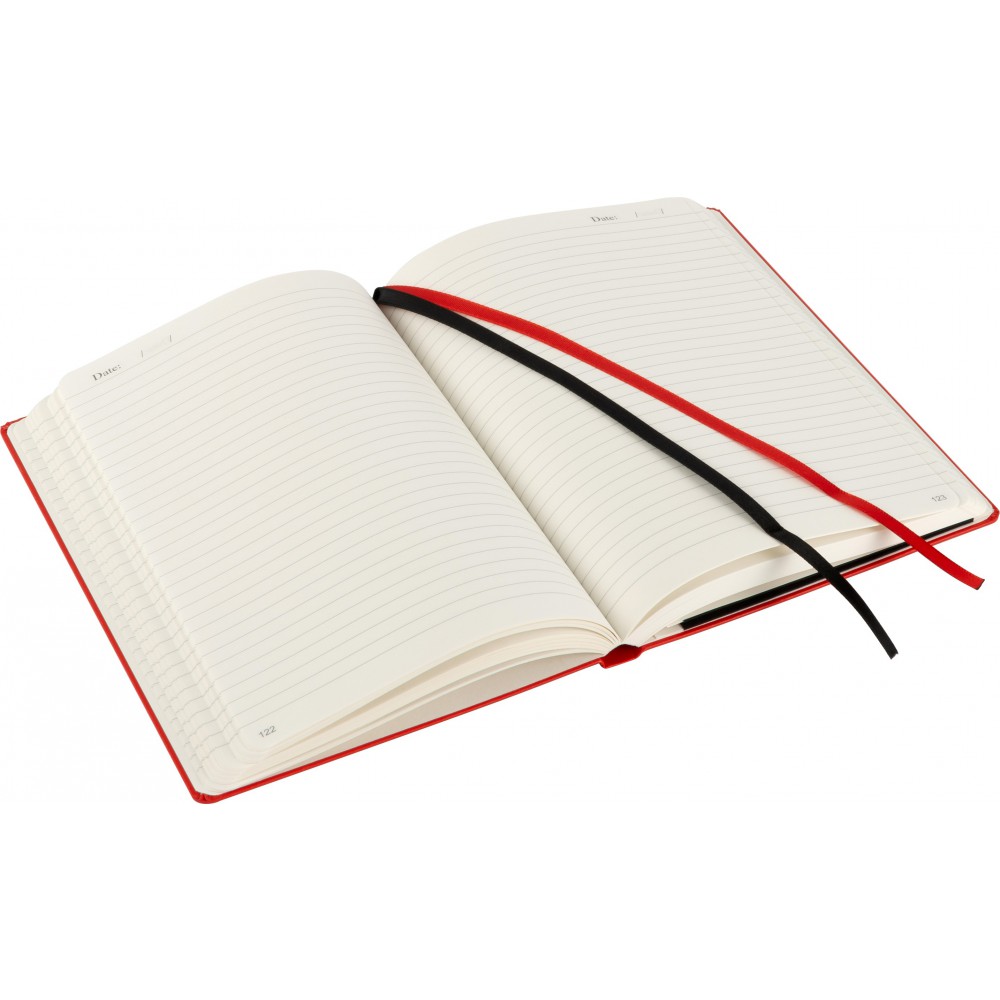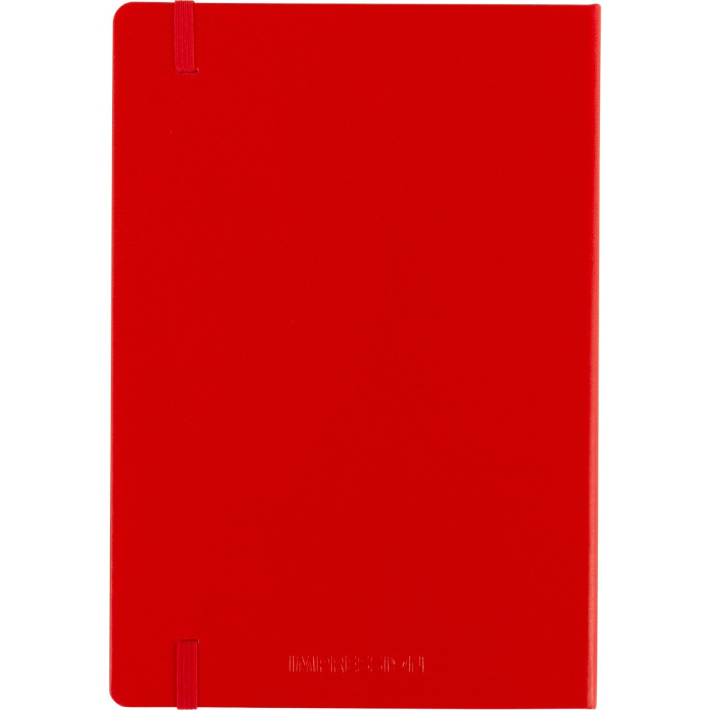 A5-ös füzet gumis záródással, 128 vonalas, dátumjelzéses lappal és papírzsebbel a hátsó, belső borítón. A külső hátsó borítón IMPRESSION logó található. PVC, 80 g papír.
