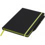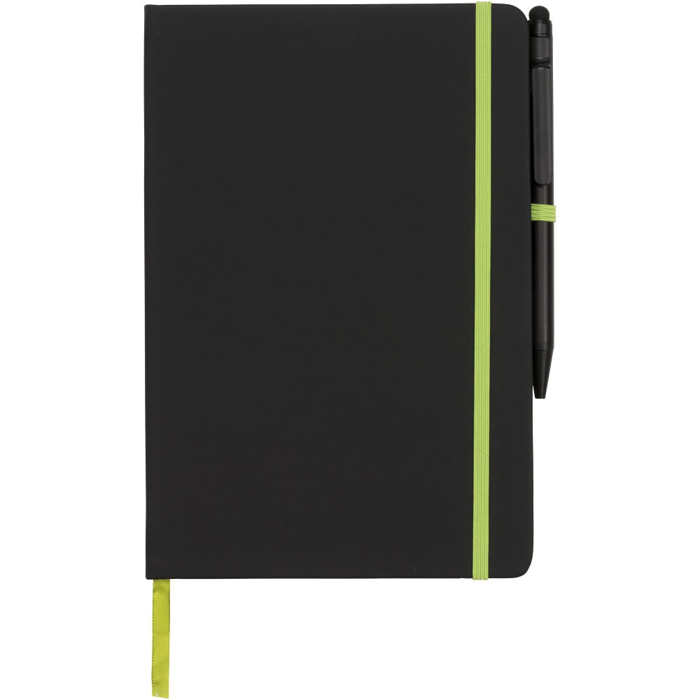 Puha felületű füzet színes lapélekkel, gumipánttal, könyvjelzővel és tullhurokkal és érintős golyóstollal. 96 krémszínű lapot tartalmaz.