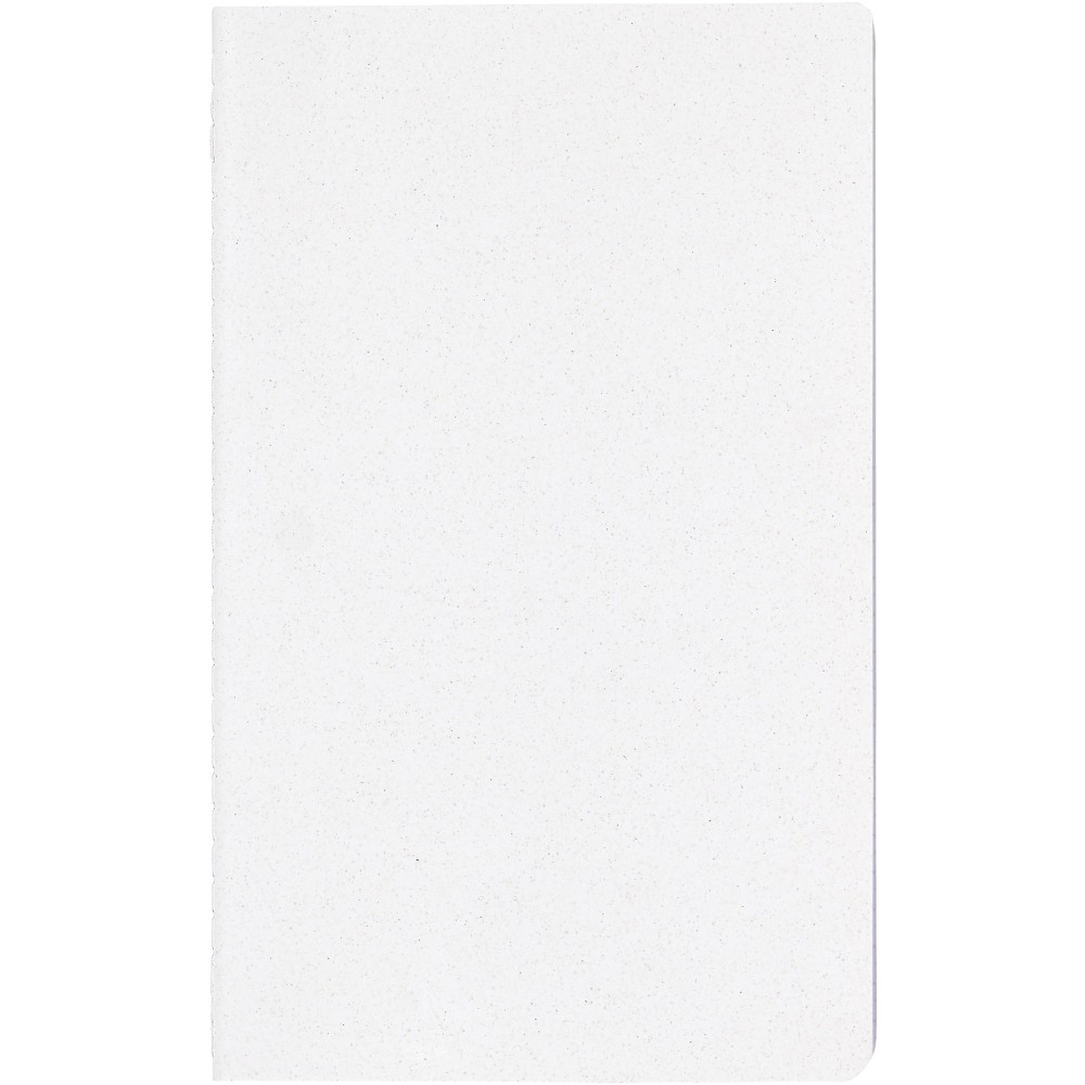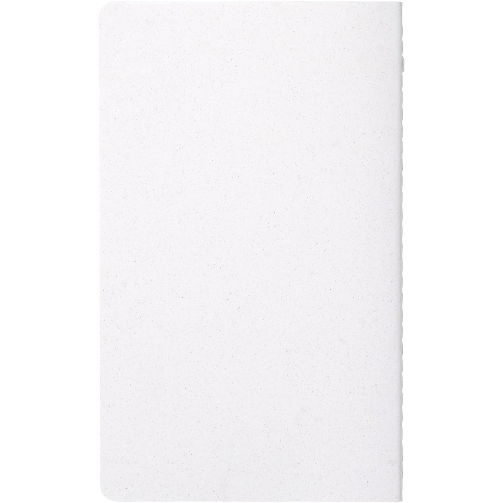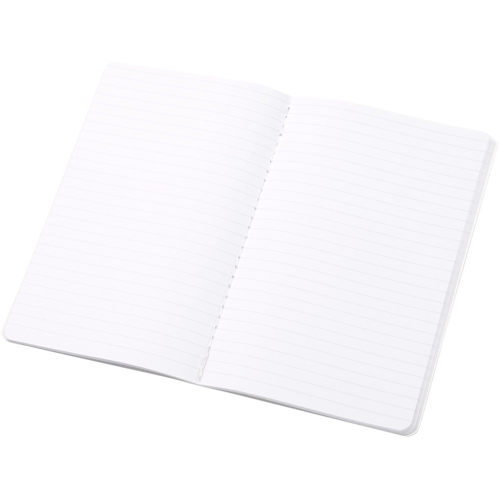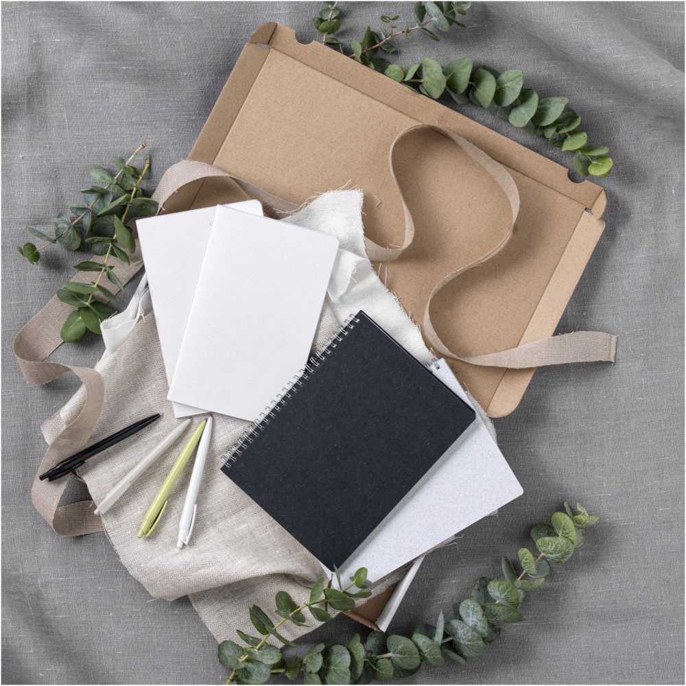 Könnyű és puha füzet. A borító felelősen előállított alapanyagokból készül. A barna borítás kávémaradványt (15%), míg a zöld borító olajbogyó-maradványanyagokat (15%) tartalmaz; mindkettő 40%-os fogyasztás utáni újrahasznosított hulladékkal kombinálva. A gerincet fehér öltések díszítik. 80 vonalas lapot tartalmaz, 70 g/m2 100%-ban felelős forrásból származó fehér újrahasznosított papírból. Olaszországban készült.