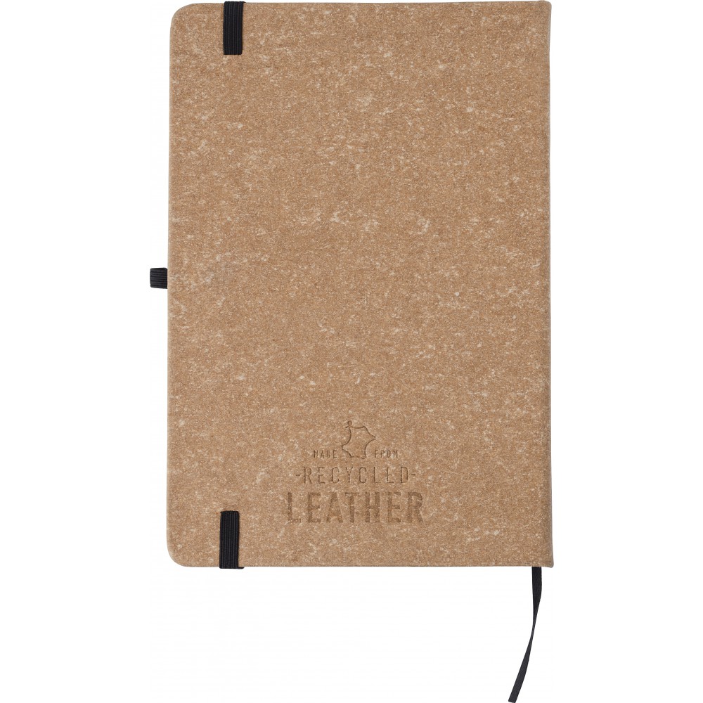 Újrahasznosított bőrből készült A5-ös jegyzetfüzet 100 vonalas lappal. Gumis záródás, tollhurok és könyvjelző szalag. Hátoldalán az újrahasznosított anyagra utaló logónyomat látható.