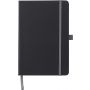 A5 füzet 96 vonalas lappal, könyvjelzővel, gumis zárópánttal. Lézergravírozás után a gravírozott felület színe megegyezik a gumipánt színével. PU anyag.