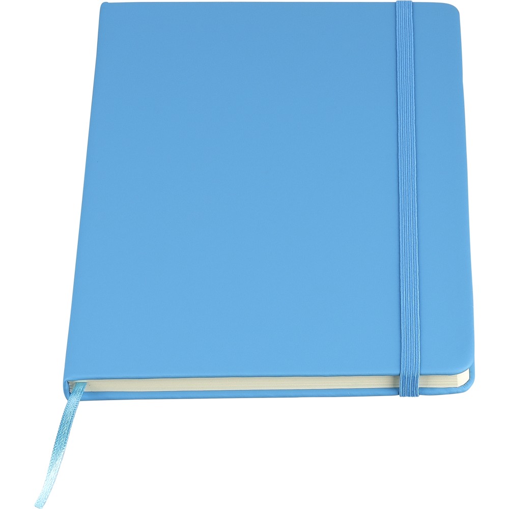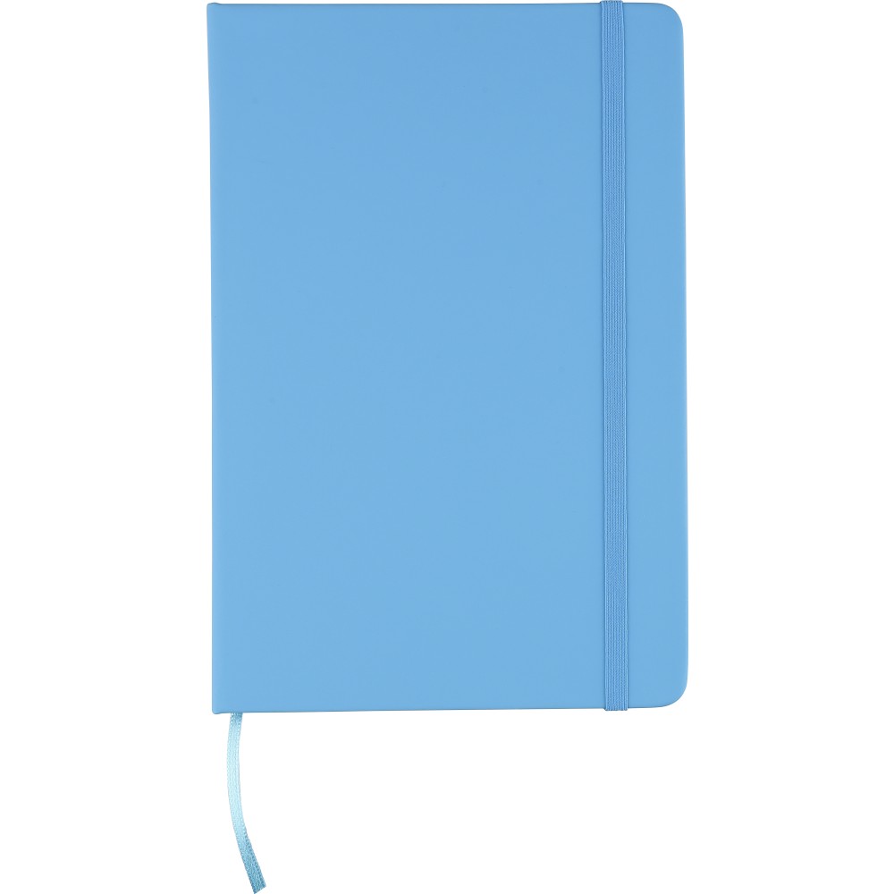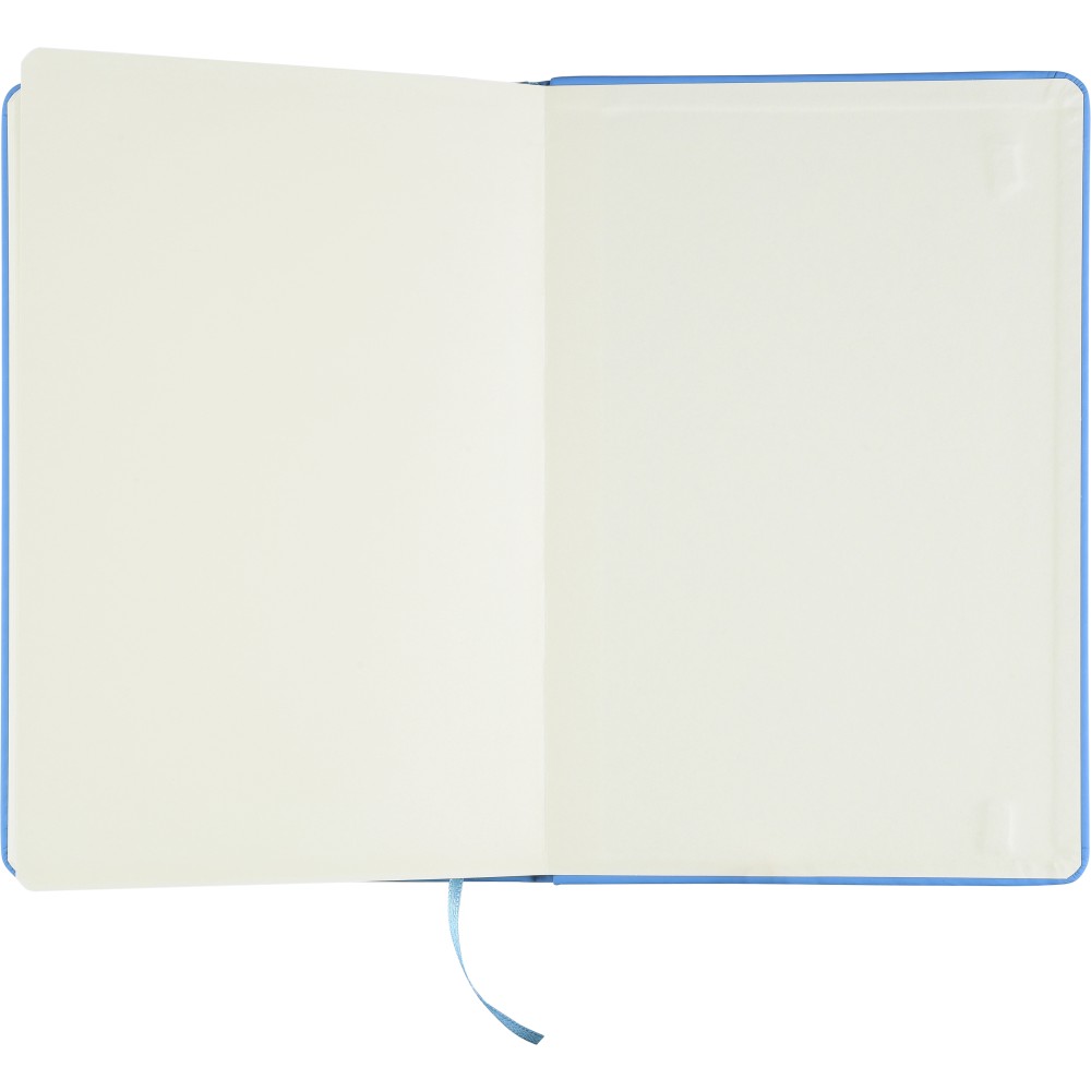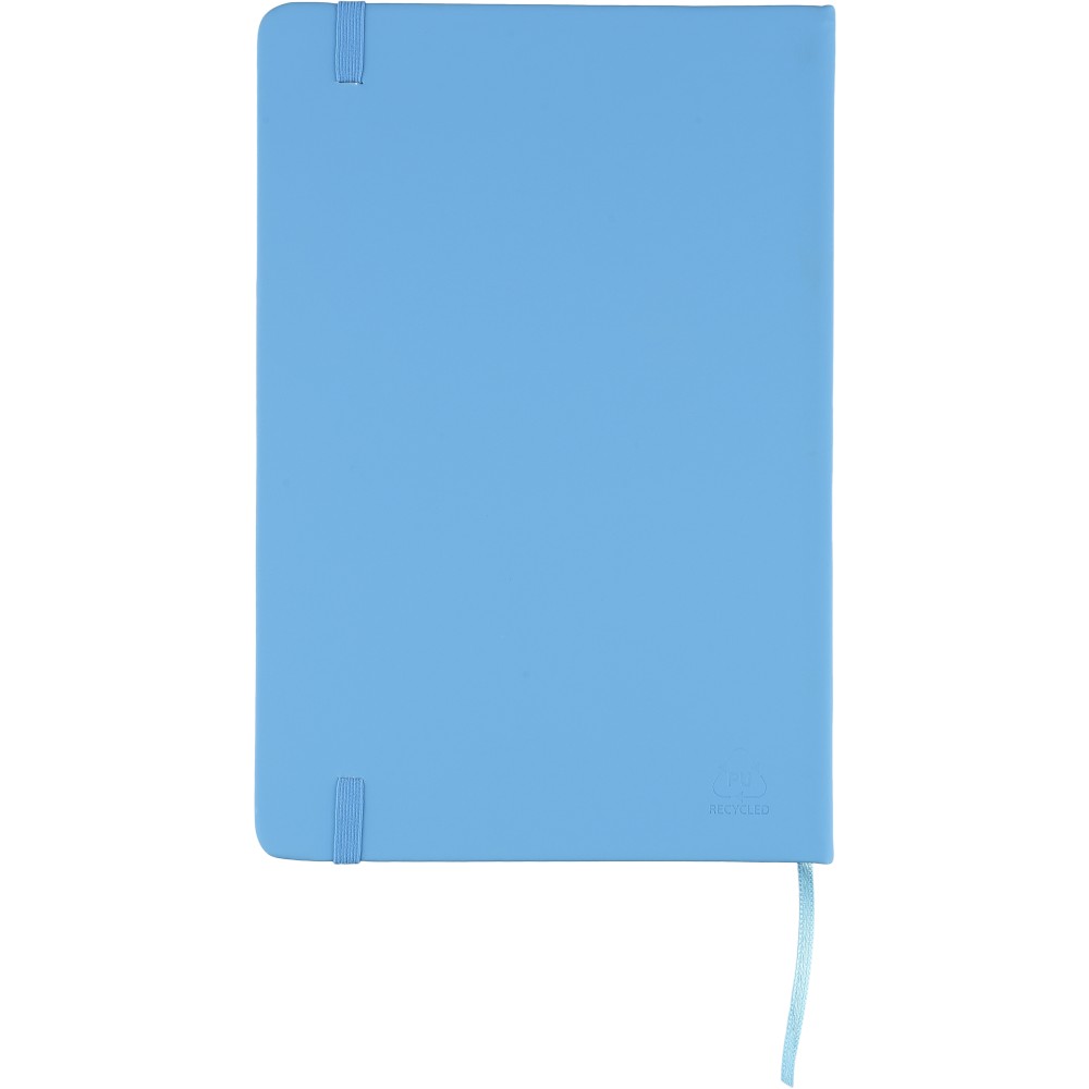 A5-ös méretű jegyzetfüzet rPET PU anyagból készült kemény borítóval, 80 vonalas lappal (70g/m2), színben illeszkedő gumipánttal és könyvjelző szalaggal. Az újrahasznosított anyagra utaló dombornyomott logóval a füzet hátoldalán.