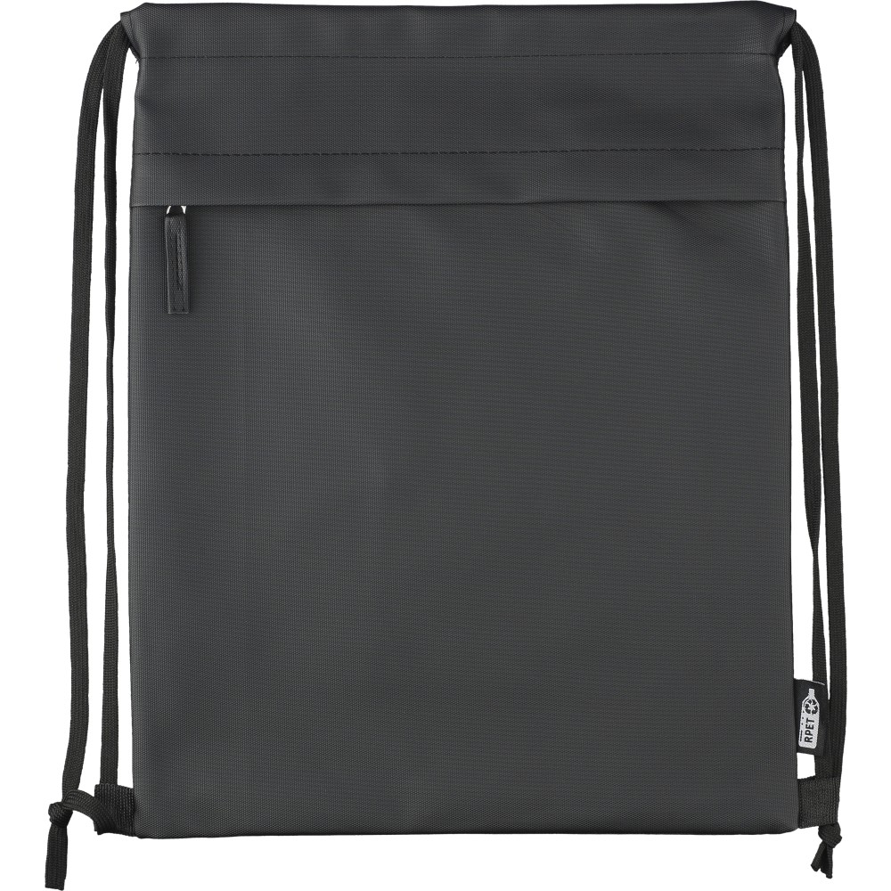 600D rPET poliészter tornazsák. Az elejét PU bevonat teszi vízlepergetővé. Rejtett cipzáras első zsebbel, két tárolórésszel, első és belső zsebekkel. Kapacitása 8 liter, teherbírása 8 kg. Oldalán rPET címkével.