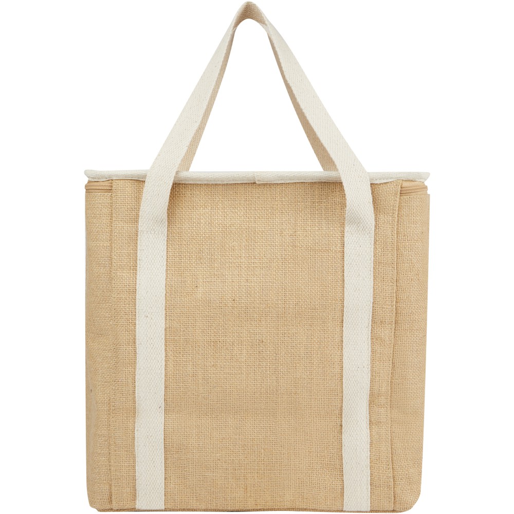 A nagy Juta hűtőtáska erős és kopásálló laminált jutából készült. Hat 1,5 literes palack tárolására alkalmas nagy (19 literes) fő rekesszel rendelkezik, extra vastag és élelmiszerbiztonsági alumínium szigeteléssel bélelve, hogy az italokat, élelmiszereket és frissítőket órákon át hűvös, száraz és árnyékolt állapotban tartsa. A táska felső cipzárral, elülső zsebbel és 2 pamut szőtt fogantyúval rendelkezik (50 x 2,5 cm). OEKO-TEX tanúsítvánnyal rendelkezik. Juta.