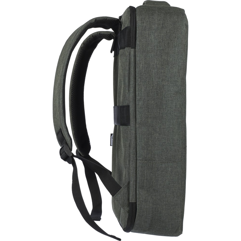 Laptophátizsák 300D rPET poliészter anyagból, 210D rPET béléssel. Egy nagy cipzáras rekesszel, számtalan belső zsebbel, tépőzáras laptoptartó zsebbel 15"-es laptop számára és 12 literes űrtartalommal. Megerősített, szellőző hátrésszel, állítható vállpánttal, oldalsó hordozófüllel és gurulóstáskára való felhelyezésre alkalmas pánttal. Teherbíró képesség: 10 kg.