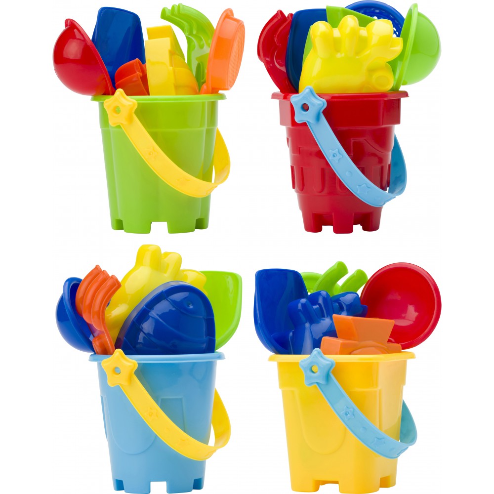 A véletlenszerű színű vödör tartalma: egy lapát, két ásó, egy szita és két homokozóforma (hal és rák alakúak). A vödör színe nem választható. BPA-mentes műanyag.