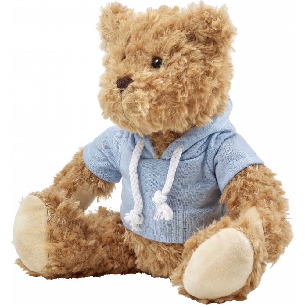 Plüssmackó kapucnis pólóban, világoskék