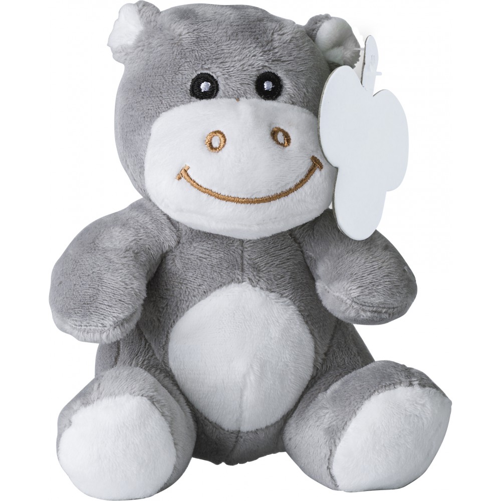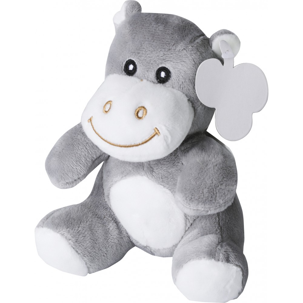 Plüss víziló hímzett szemekkel, fülében emblémázható címkével.