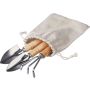 Kerti szerszámkészlet, amely két különböző lapátot és egy gereblyét tartalmaz. Az eszközök rozsdamentes acélból készültek, a nyelek fából. Egyenként pamut zsinóros tasakba csomagolva. Anyaga: rozsdamentes acél és fa.