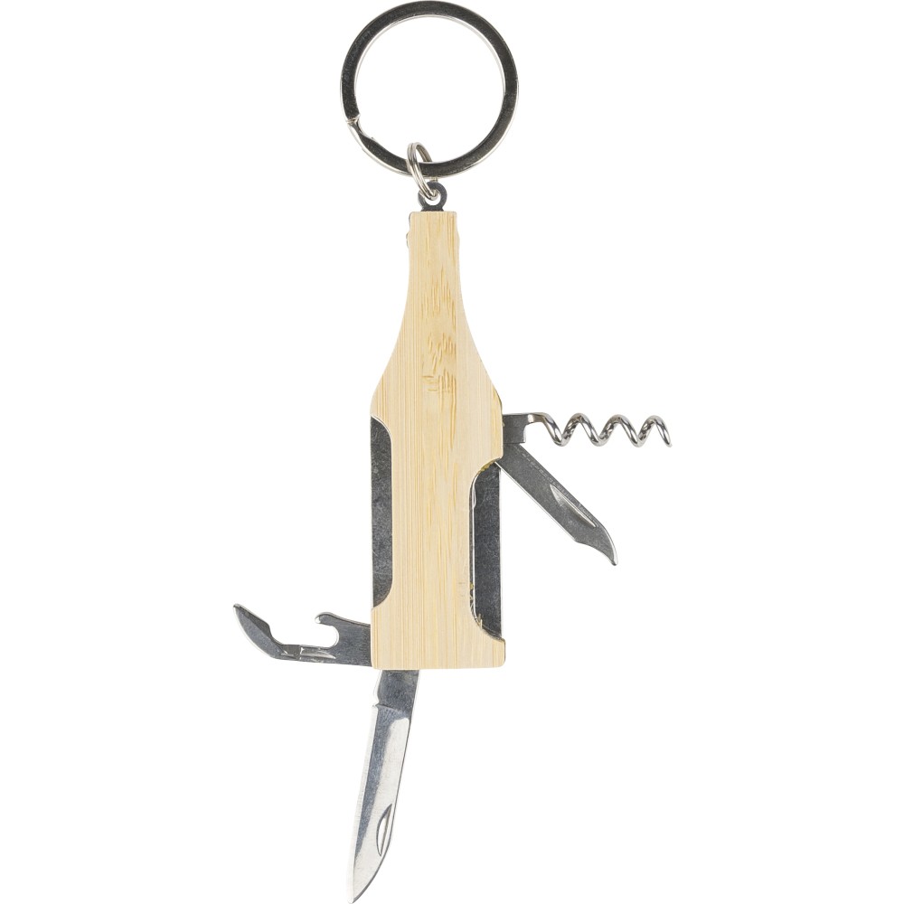 Bambuszból és rozsdamentes acélból készült, palack formájú multifunkciós kulcstartó fém kulcskarikával, dugóhúzóval, körömreszelővel, sörnyitóval és vágókéssel. Egyenként barna kartondobozba csomagolva.
