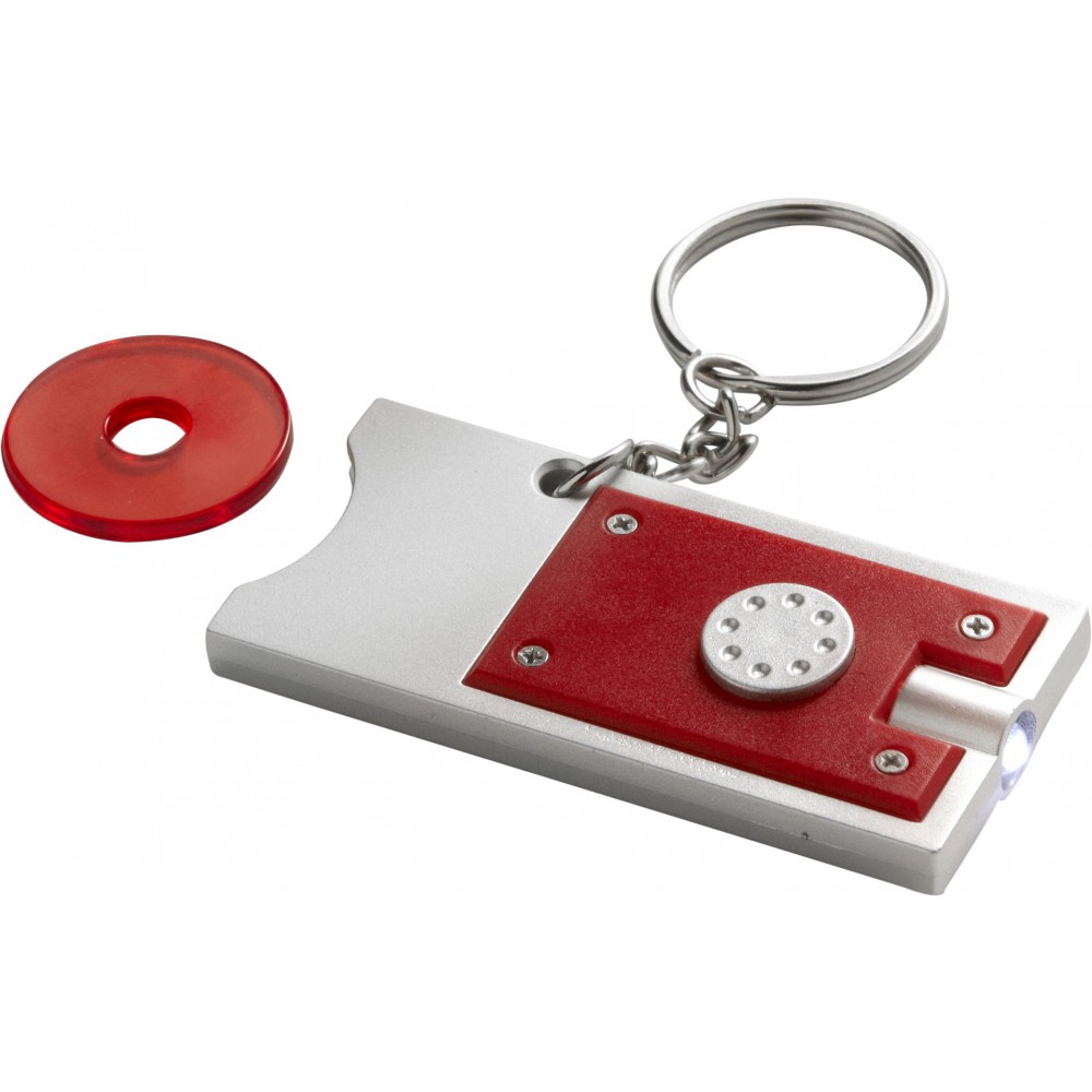 Világítós kulcstartó érmetartóval, ezüst/piros