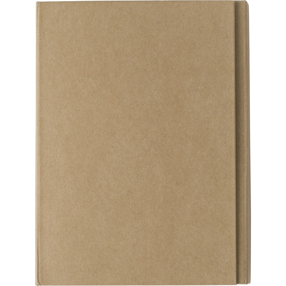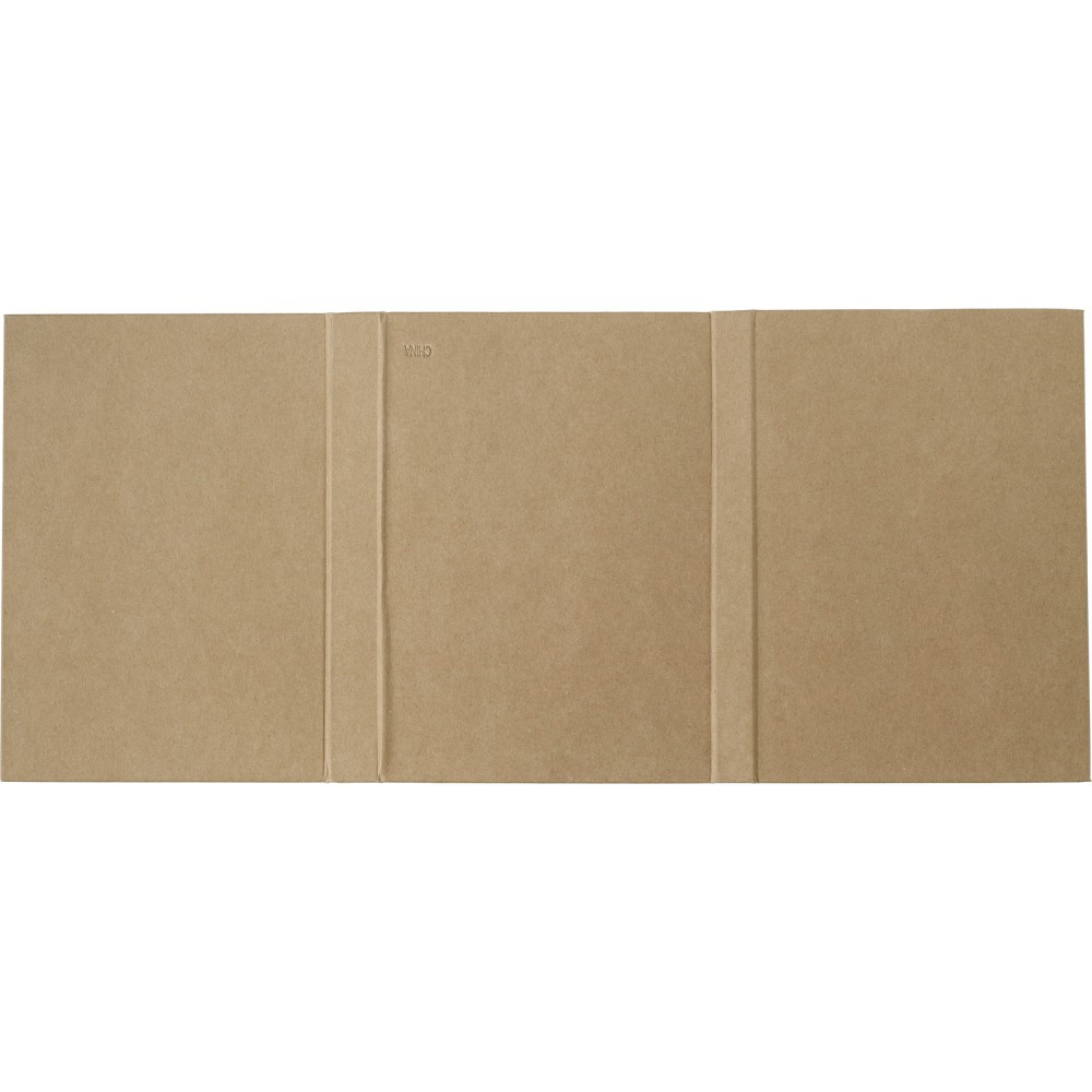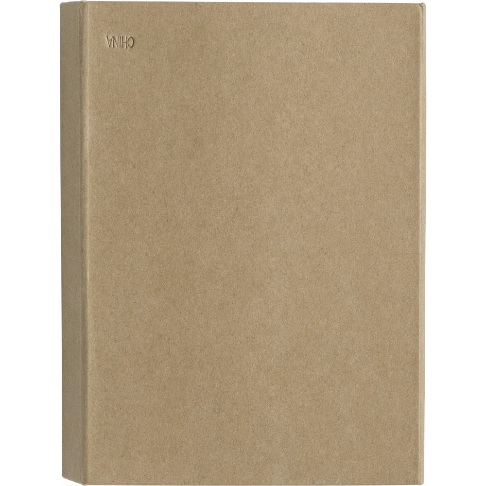 Irodaszermappa tartalma: negyven lapos jegyzetfüzet, bambusz vonalzó (15 cm), karton toll műanyag heggyel, klipsszel és nyomógombbal, kék tollbetéttel, valamint két ceruza, hegyező, radír, öntapadó jelölők (25 lap színenként) és egy belső zseb. Fa, karton, gumi, EVA, papír.