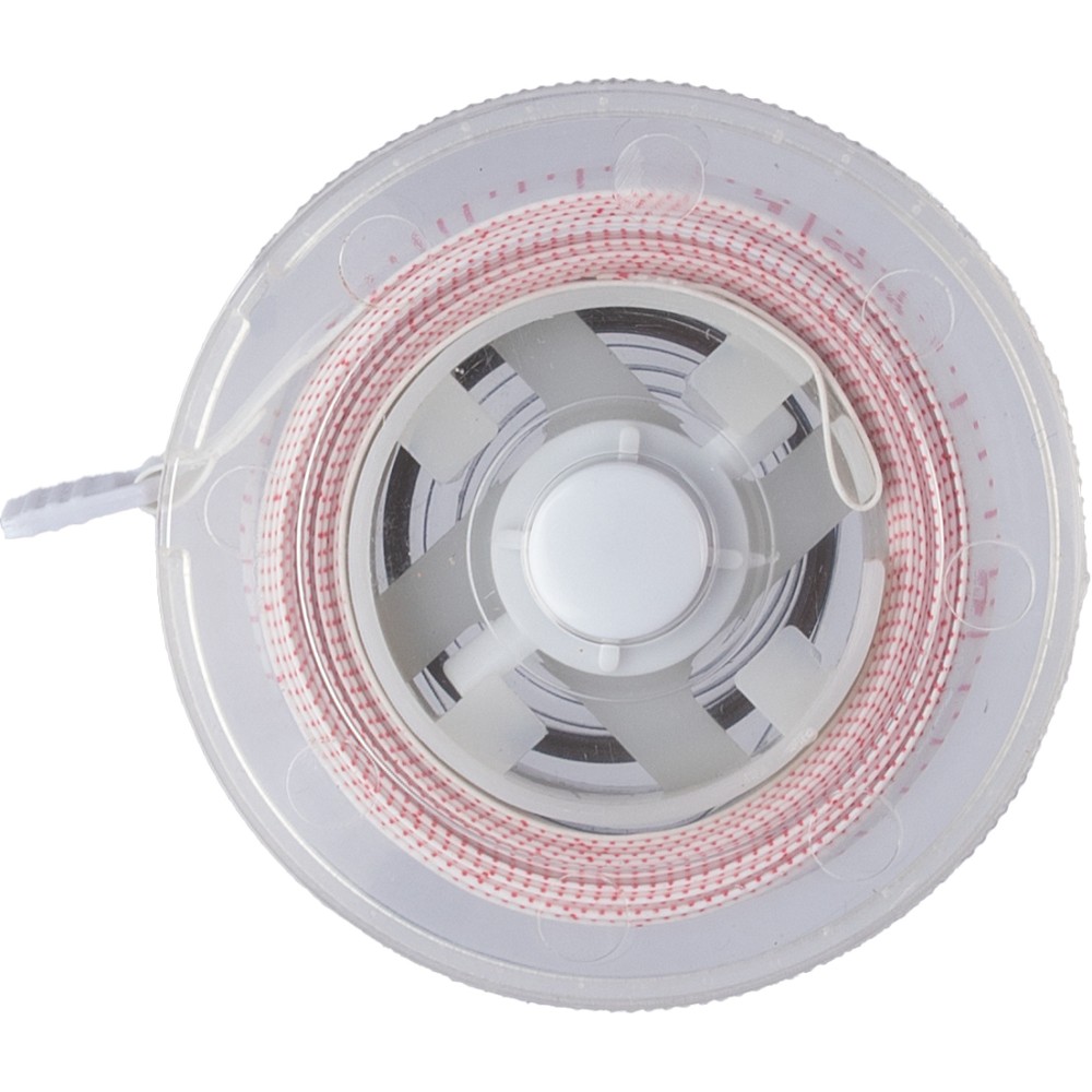 Mérőszalag átlátszó házzal és színes mérőszalaggal. Nyomógombbal és reteszelő mechanizmussal rendelkezik. A nyomtatási terület a hátoldal sík felületén található. 1,5 méter.