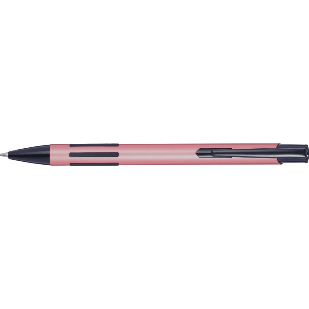 Golyóstoll lakkozott felülettel, nyomógombbal, kék tollbetéttel. A klipsz, a hegy és a gumis fogófelület színe illeszkedő fekete. alumínium, PVC, gumi