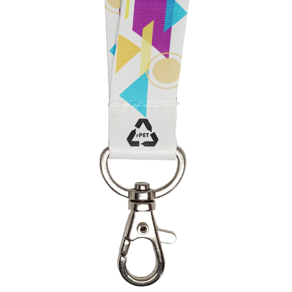 Szublimációs nyomással, teljes felületen dekorálható újrahasznosított PET (RPET) nyakpánt nikkelmentes cseppkarabinerrel. Csak dekorálva rendelhető. A szalag hossza: 92 cm. További rendelhető kiegészítők: vinil kártyatartó (RAM1161), proxy kártyatartó (RAM1162), biztonsági kioldó (RAM1173), oldható csat (RAM1123).