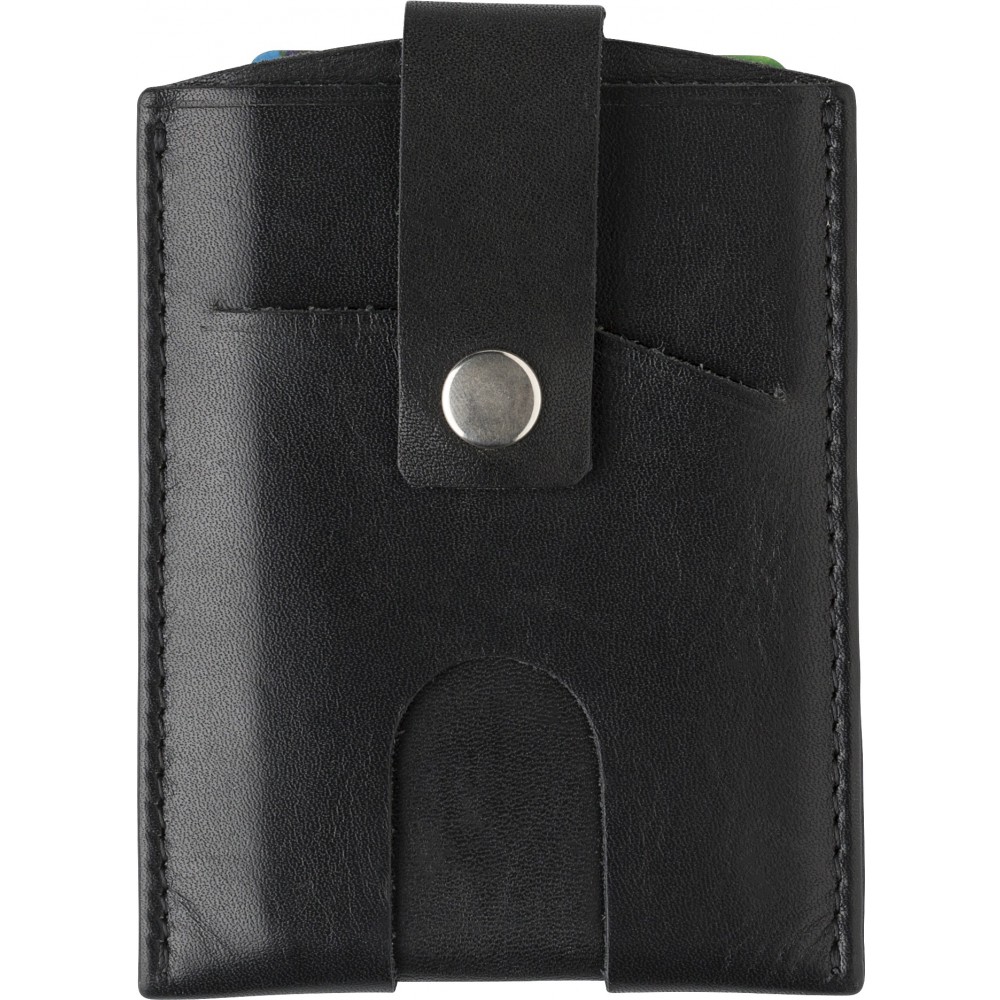 Hasított bőr kártyatartó RFID védelemmel az adatlopás ellen, kipattintható tartóval.