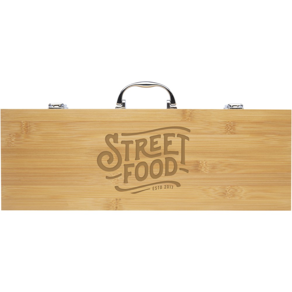 5 részes bambusz BBQ készlet lapáttal (40 x 9,5 cm), fogóval (34,5 x 6 cm), villával (38,5 x 3 cm), késsel (38,5 x 3 cm) és kefével (38 x 4,3 cm). A készletet bambusz díszdobozban (46 x 16,2 x 7,4 cm) szállítjuk. A fogantyúk és az ajándékdoboz bambuszból készülnek, amelyet a fenntartható szabványok szerint szereztek be és gyártottak.