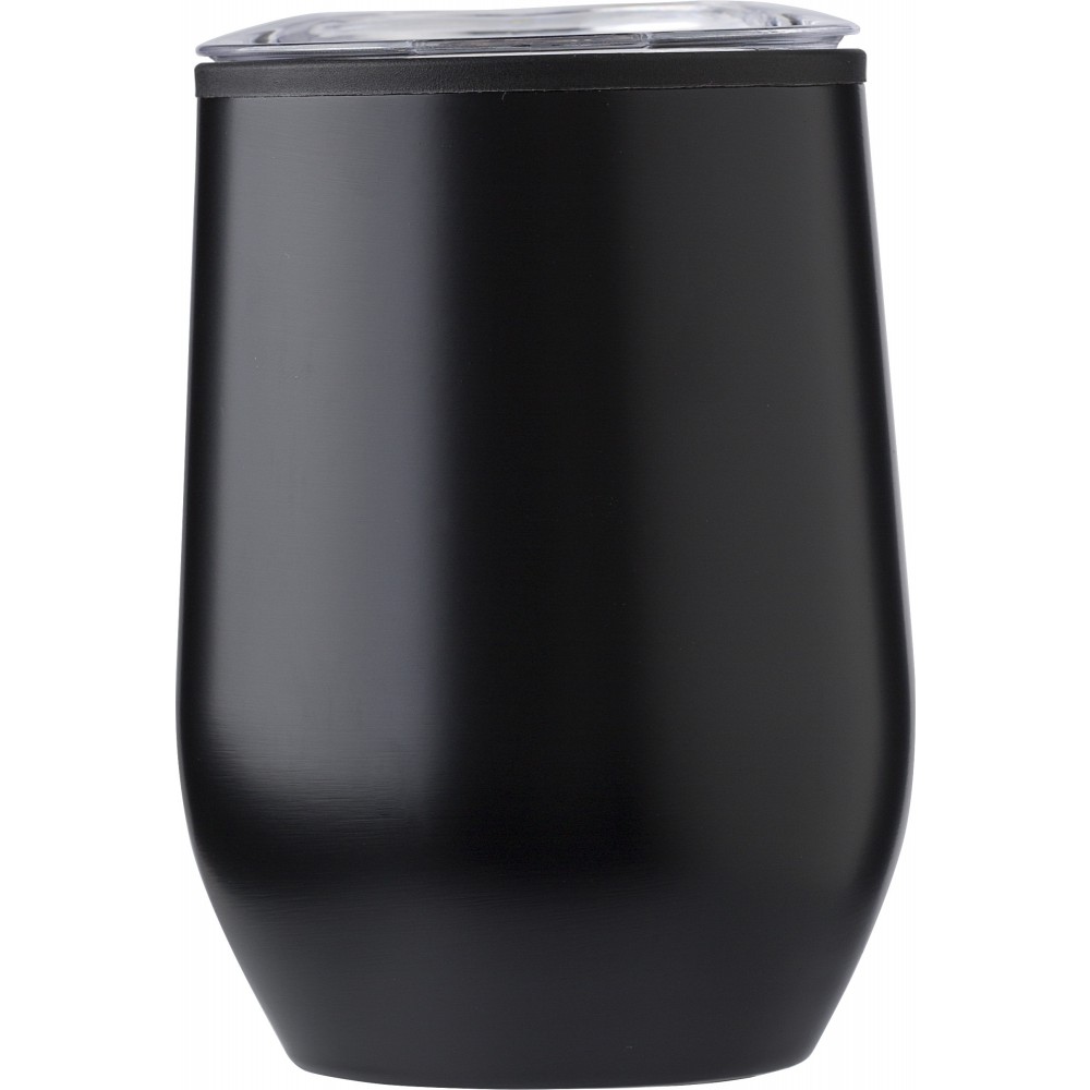 Rozsdamentes acél utazópohár PP belsővel és PS tetővel. A bögre matt felületű. Barna kartondobozba egyedileg csomagolva. Űrtartalom: 300 ml.