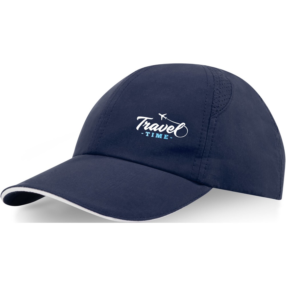 Újrahasznosított poliészterből készült, GRS tanúsítvánnyal rendelkező baseballsapka fém csattal. Lézeres technikával vágott szellőzőkkel rendelkezik. 110 g/m2.