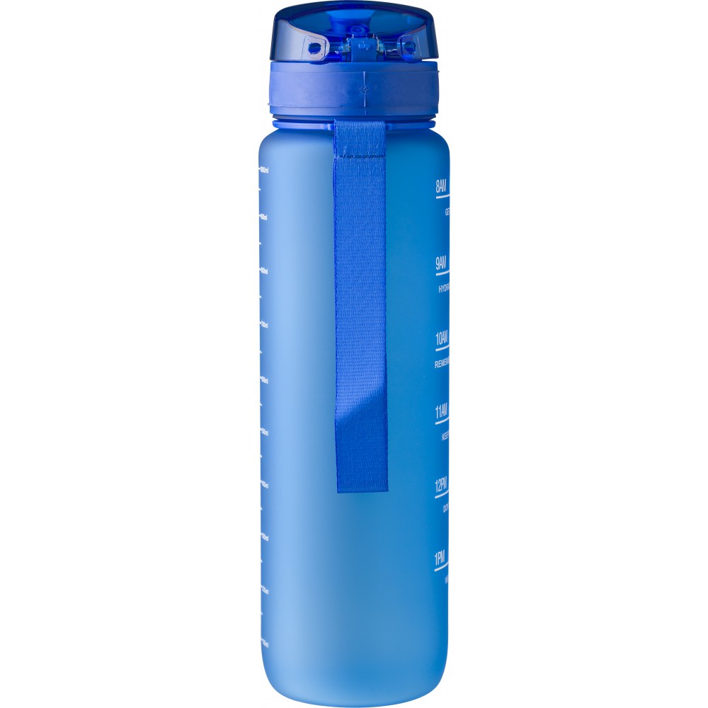 Műanyag motivációs palack szivárgásmentes kupakkal, csuklópánttal, matt bevonattal. Oldalán beosztással. Űrtartalom: 1 liter.