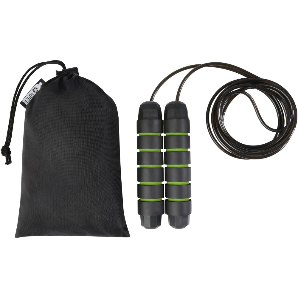 Professzionális ugrálókötél felnőtteknek, ergonomikusan kialakított puha habszivacs fogantyúkkal, mely szilárd és kényelmes fogást biztosít edzés közben. A kötél hossza 310 cm, ami könnyű ugrást tesz lehetővé felnőttek számára 195 cm hosszúságig. A kötél hossza állítható, és beépített, kiváló minőségű, 360 fokban forgatható, nagy sebességű golyóscsapággyal rendelkezik, amely biztosítja a zökkenőmentes, könnyed forgást és elkerüli a gubancolódást. Újrahasznosított PET műanyagból készült tároló tasakkal (21 x 14 cm) szállítjuk, amely remek helyet biztosít a logó nyomtatásához.