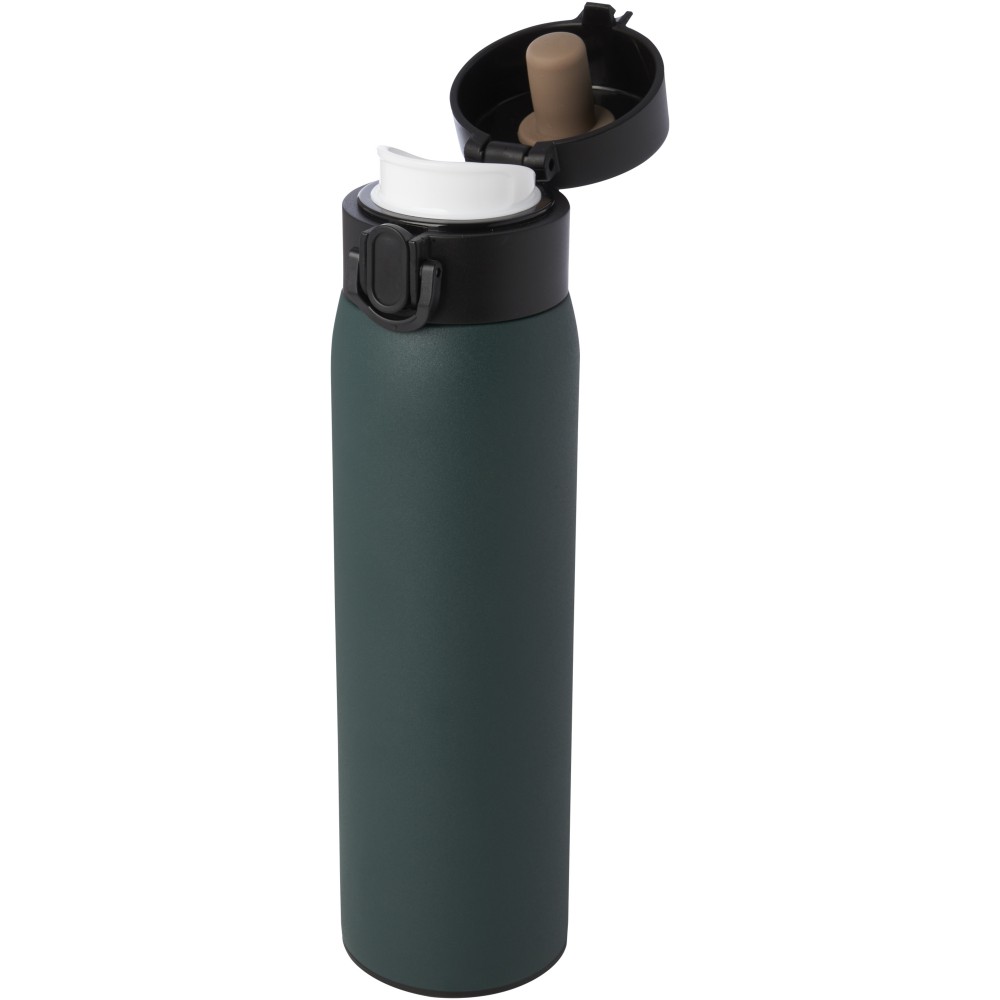Stílusos, RCS tanúsítvánnyal rendelkező újrahasznosított rozsdamentes acélból készült, szigetelt palack gombos nyitómechanizmussal. A flaska szivárgásmentes és a réz vákuumszigetelésnek köszönhetően az italokat több órán keresztül forrón vagy hidegen tartja. Űrtartalom: 450 ml. Újrahasznosított kartonból készült díszdobozban szállítjuk.