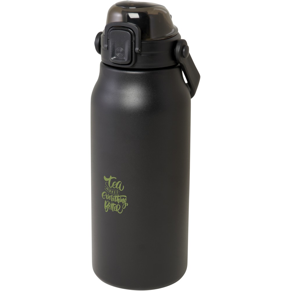 Ez a nagyméretű, RCS tanúsítvánnyal rendelkező, újrahasznosított rozsdamentes acél palack stílusosan hidratál egész nap. A réz vákuumszigetelés több órán át melegen vagy hidegen tartja az italokat, és az összecsukható fogantyúval könnyen hordozható. A palack szivárgásmentes, és gombos nyitómechanizmussal rendelkezik. Nagy űrtartalmú palack: 1600 ml. Újrahasznosított kartonból készült díszdobozban szállítjuk.