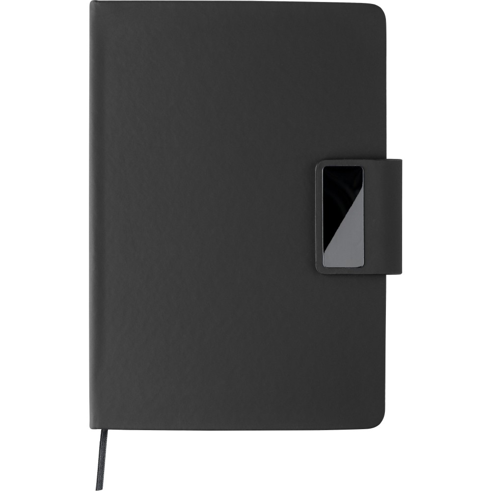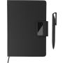 Karton ajándékkészlet. Tartalma: újrahasznosított alumínium csavaros golyóstoll kék tintával és újrahasznosított PU jegyzetfüzet. A jegyzetfüzet 80 lapos 70 g/m2-es vonalas papírral, és szalagos könyvjelzőt és fém mágneses zárat tartalmaz acélszürke gravírozott lappal. Mindkét termék újrahasznosított logóval van ellátva: dombornyomva a jegyzetfüzeten és gravírozva a tollon.