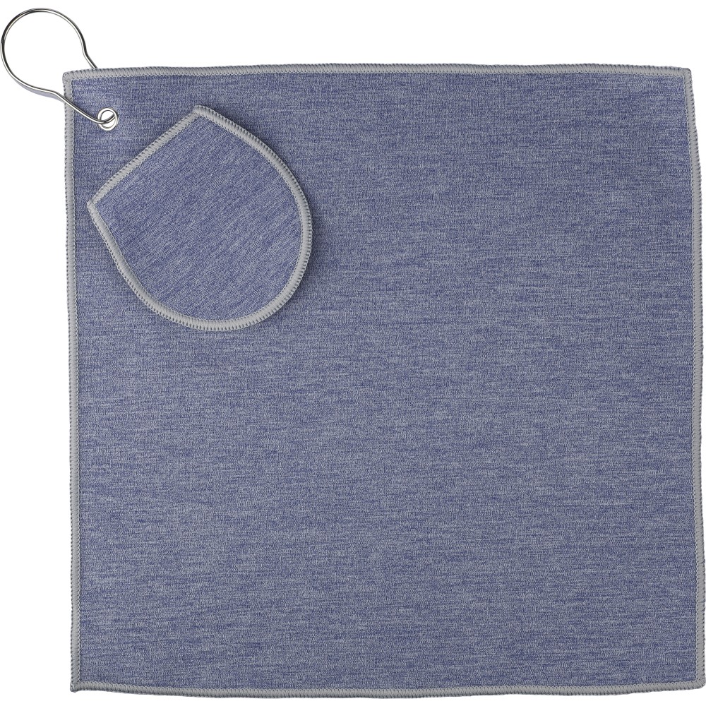 rPET golftörölköző tartozék labdatartó tokkal. A fém kampó segítségével könnyen a táskához csatlakoztatható. Belül rPET címkével. Mosógépben alacsony hőmérsékleten mosható.