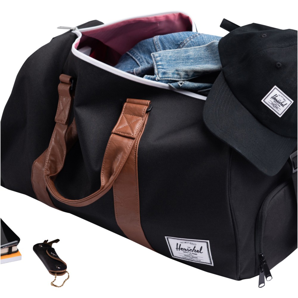 A tökéletes útitáskát keresed? A Herschel Novel táska a tiéd. Masszív tartósságra és intelligens szervezésre tervezték, és jellegzetes cipőrekesszel rendelkezik. A 100%-ban újrahasznosított EcoSystem szövetekből szakértelemmel készített táska kényelmesen elfér a repülőgépek fej feletti csomagtartójában is, így tökéletes útitárs. A 600D anyagot átgondoltan 100%-ban újrahasznosított vizespalackokból alakították ki, míg a vízálló cipzáras zárás biztosítja az értékes alapvető dolgok védelmét. Ez a táska vegán bőrből készült fogantyúval és levehető, sima hevederes vállpánttal rendelkezik, amely EVA párnázással van ellátva a kényelmes hordozás érdekében. A Herschel Novel táska egy külső zsebbel is rendelkezik, amely lehetővé teszi, hogy könnyedén rendszerezze és hozzáférjen holmijaihoz. A 43 literes térfogatának köszönhetően tökéletes útitárs a következő kalandodhoz.