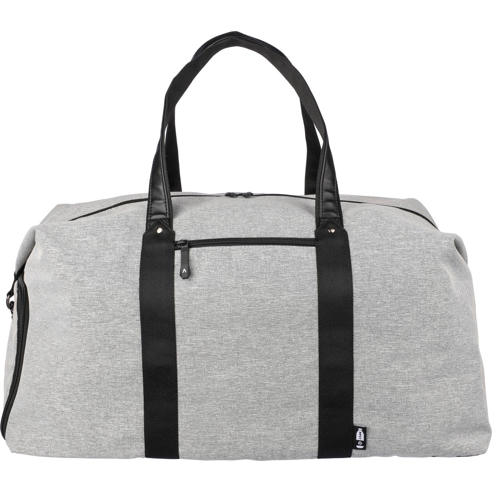 Táska műbőr részletekkel. Belső része 4 mm-es habbal és 1 mm-es PE merevítővel rendelkezik. Tartalmaz egy kis cipzáras rekeszt elöl, egy nagy cipzáras rekeszt és egy oldalsó cipőtartó zsebet. Állítható vállpánttal és két nagy fogantyúval ellátva. Az elülső részen rPET anyagra utaló címke található. Anyaga: 600D újrahasznosított poliészter.