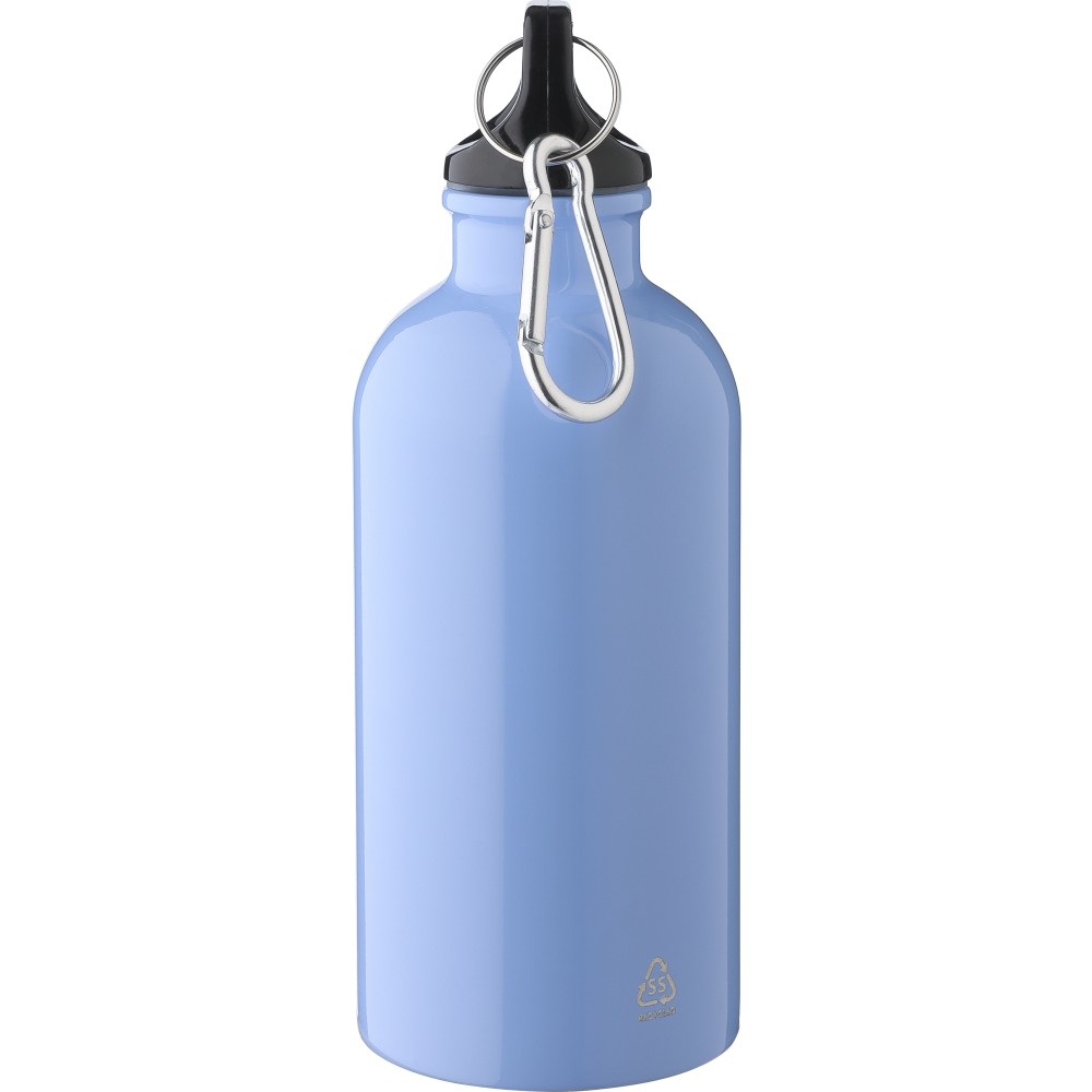 Újrahasznosított rozsdamentes acélból készült 400 ml-es szimplafalú kulacs PP kupakkal és alumínium karabinerrel. Az újrahasznosított anyagra utaló logó a palackra van gravírozva. Mosogatógépben nem tisztítható.