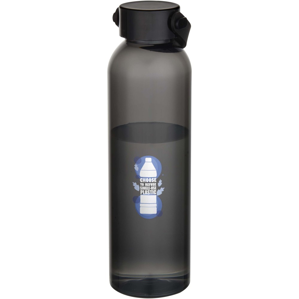 RCS tanúsítvánnyal rendelkező RPET-ből készült kulacs, praktikus szilikon hordozófüllel. Megfelel az EFSA által jóváhagyott PET-újrahasznosítási eljárásnak. Űrtartalom: 630 ml.